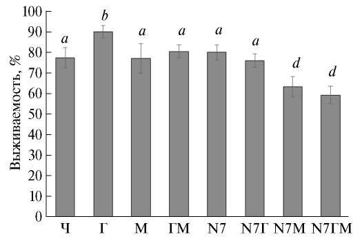 Рис. 1. Выживаемость растений Sorghum bicolor в условиях вегетационного опыта. Полосы погрешностей означают доверительный интервал, рассчитанный для n ≥ 5 при P ≤ 0.05; одинаковыми буквами отмечены значения, достоверно не отличающиеся между собой при P ≤ 0.05. Ч – чистый вариант, Г – н-гексадекан, М – металл (Ni2+), N7 – бактерии Gordonia sp. N7.