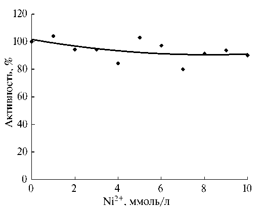 Рис. 6. Влияние никеля в возрастающей концентрации на активность очищенной катионной пероксидазы из корней Sorghum bicolor (с ДАФ). По оси ординат активность фермента в % к варианту без никеля. При концентрации никеля 0 мМ активность принимали за 100%.