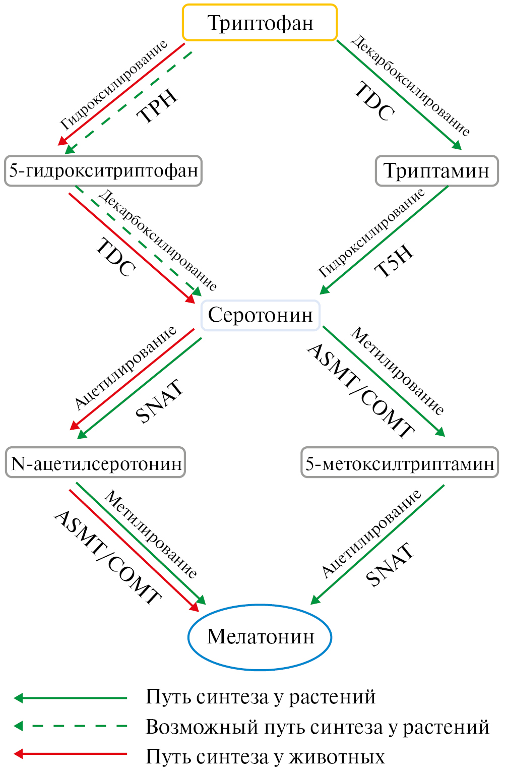 Рис. 1. Схема синтеза мелатонина у животных и фитомелатонина у растений. Синтез мелатонина у животных идет по одному стандартному пути (красные стрелки). Синтез ФМТ более сложен, доказан один путь превращения триптофана в серотонин и два пути превращения серотонина в ФМТ (зеленые стрелки). Существуют некоторые свидетельства превращения триптофана в серотонин по животному пути (зеленые пунктирные стрелки). При этом в реакциях принимают участие не менее 6 ферментов: TDC – триптофандекарбоксилаза, TPH – триптофан-5-гидроксилаза, T5H – триптамин-5-гидроксилаза, SNAT – серотонин-N-ацетилтрансфераза, ASMT – ацетилсеротонинметилтрансфераза, COMT – серотонин-O-метилтрансфераза кофейной кислоты.