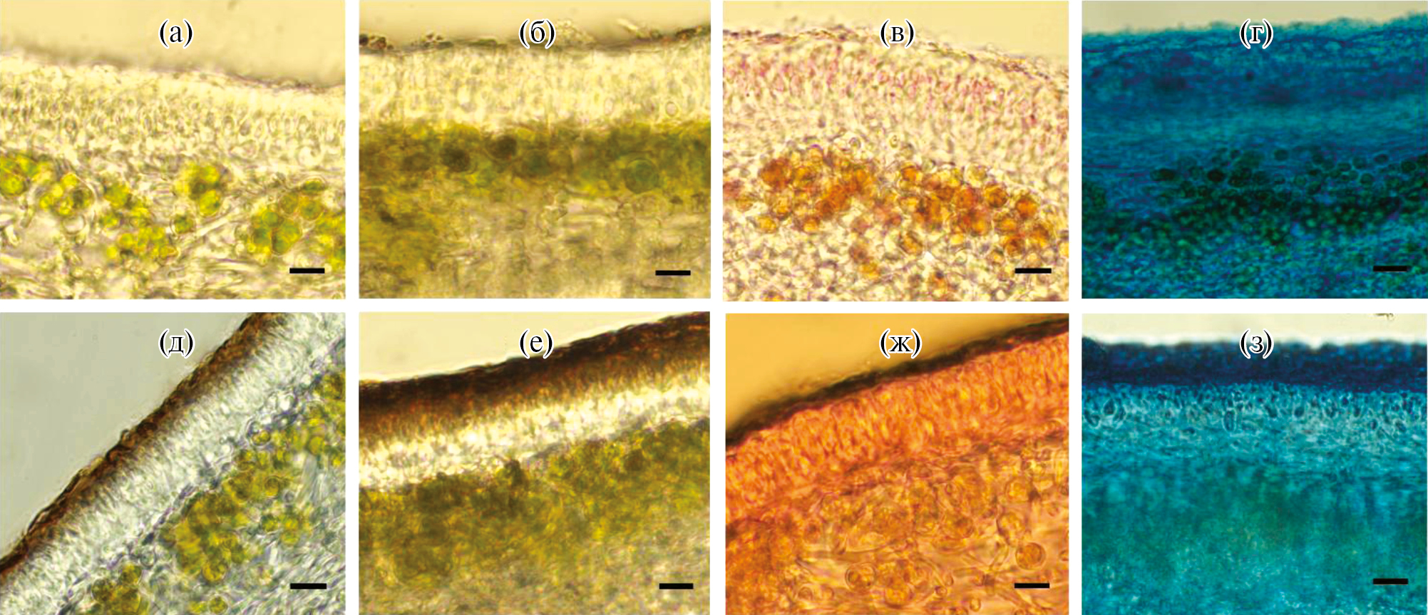 Рис. 1. Поперечные срезы бледных (а-г) и меланизированных (д-з) талломов лишайника C. islandica: неокрашенные талломы (а, д); L-ДОФА окрашивание (б, е); окрашивание по Рожнаку (в, ж) и по Лилли (г, з). Масштабная линейка – 10 мкм.