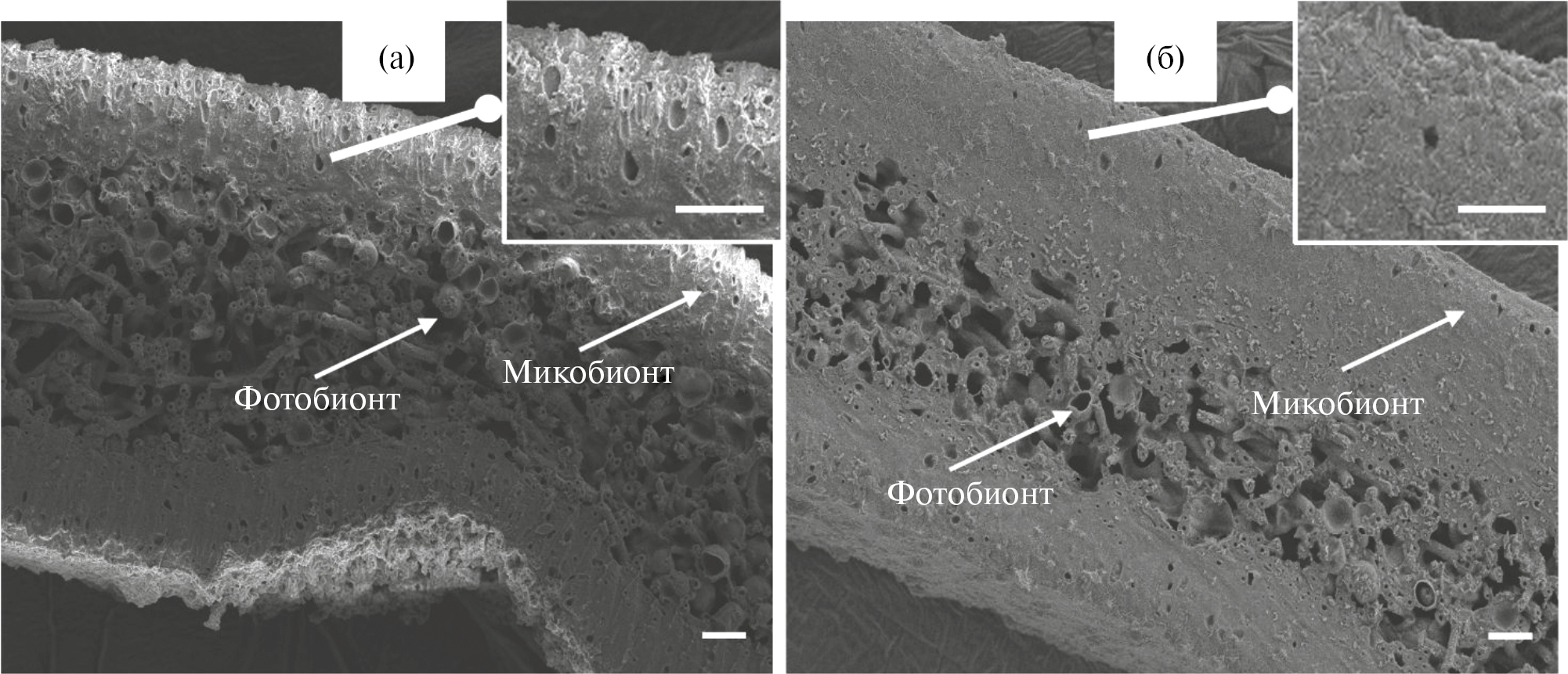 Рис. 2. Сканирующие электронные микрографии поперечных срезов бледного (а) и меланизированного (б) талломов лишайника C. islandica. Масштабная линейка – 10 мкм.