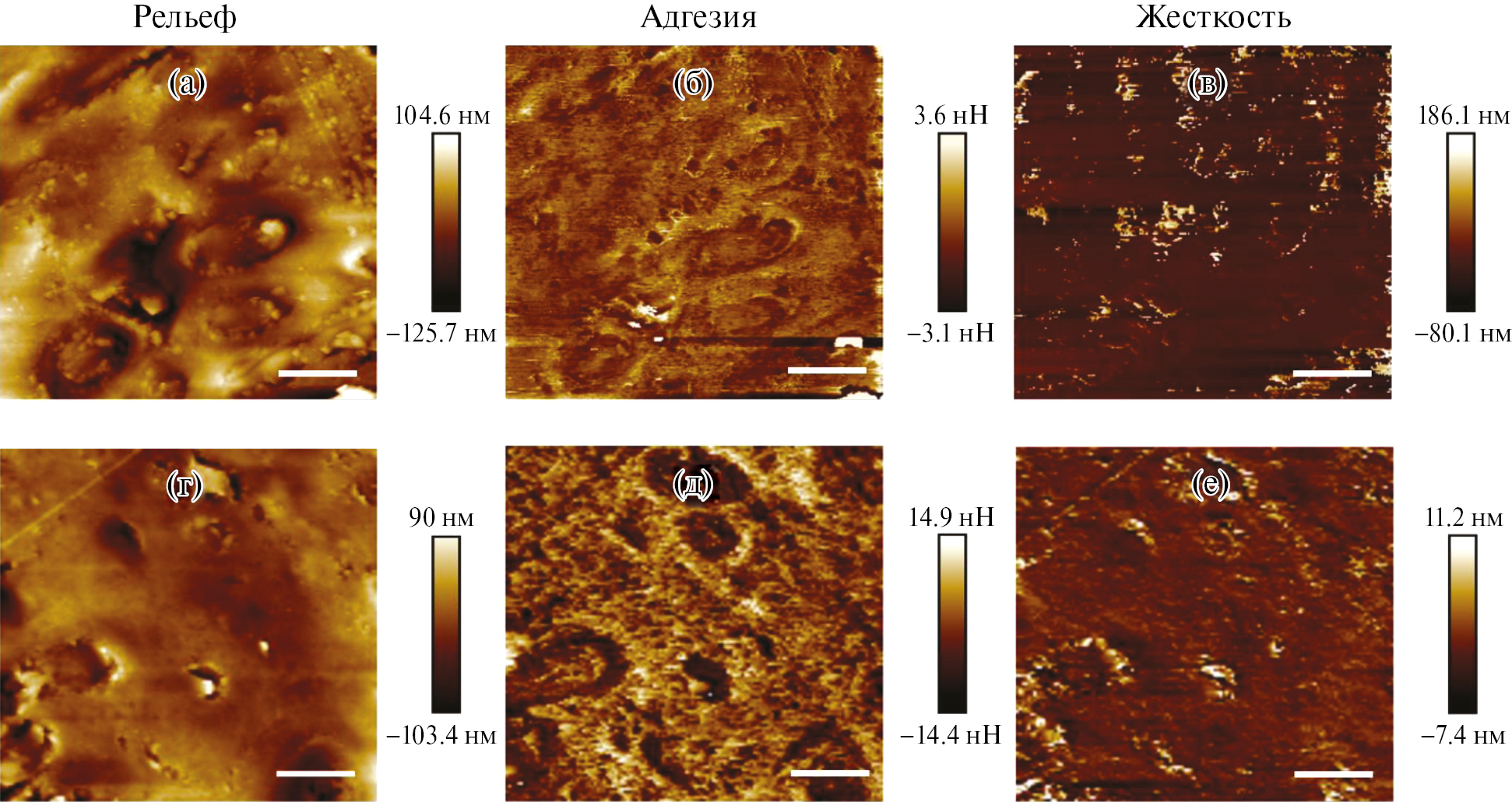 Рис. 3. Рельеф (а, г), адгезия (б, д), жесткость (в, е) поверхности поперечных срезов бледного (а–в) и меланизированного (г–е) талломов лишайника C. islandica, полученные с помощью атомно-силовой микроскопии. Масштабная линейка – 2 мкм.