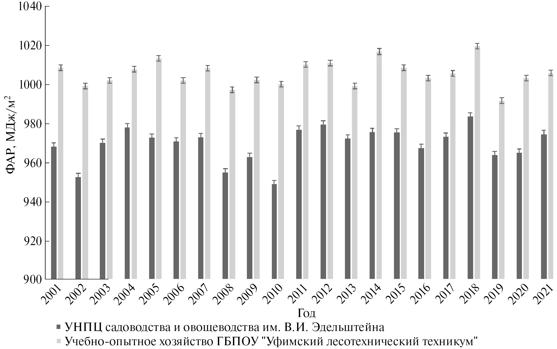Для растений наиболее важным фактором являются ресурсы солнечной радиации. Оценка интенсивности светового потока в период вегетации обычно проводится по распределению ФАР, которая при ясном небе является одним из важнейших факторов продуктивности культур [25]. Для теплицы учебно-опытного хозяйства ГБПОУ “Уфимский лесотехнический техникум” ФАР за последние 20 лет превышает величину ФАР для теплицы УНПЦ садоводства и овощеводства им. В.И. Эдельштейна. Различия являются статистически достоверными (рис. 1).