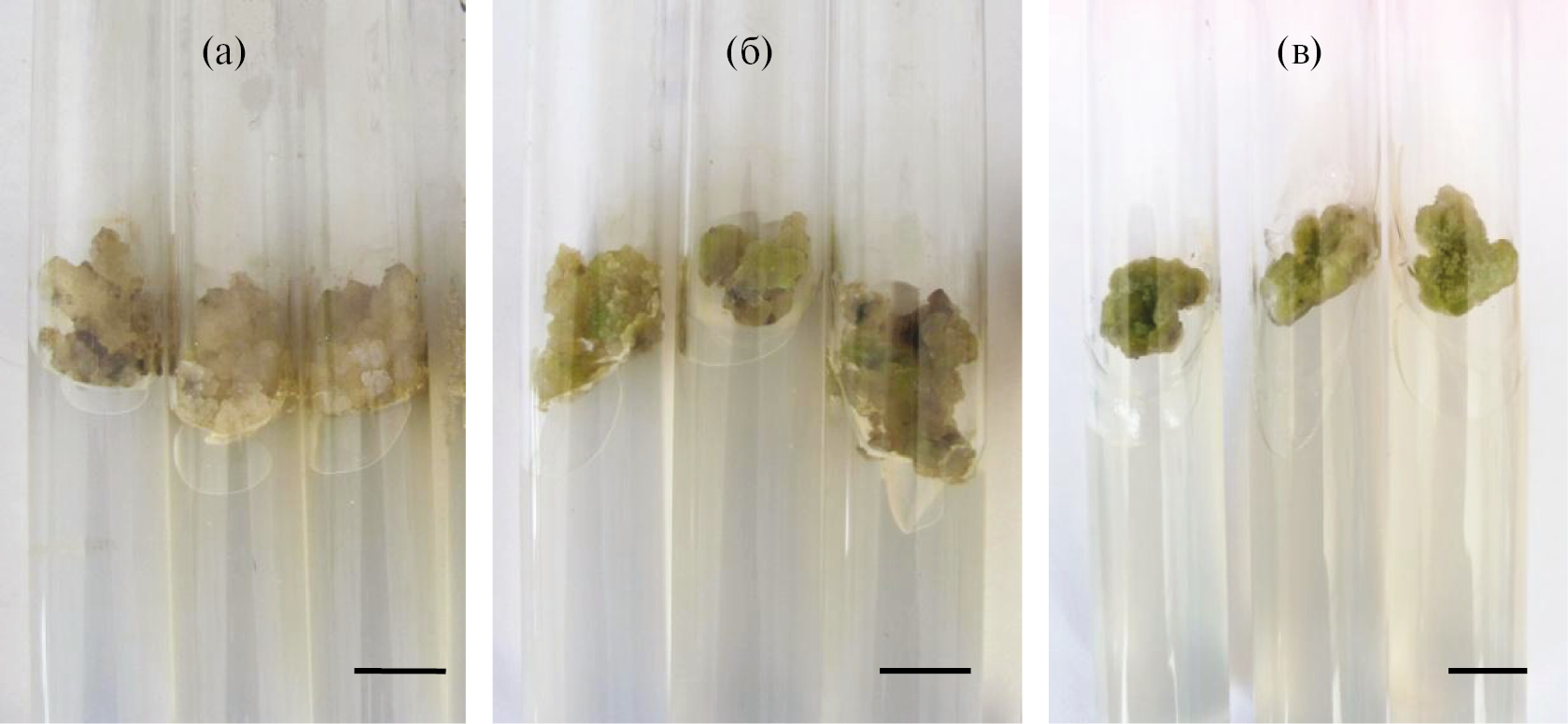 Рис. 1. Каллусные культуры M. officinalis, полученные из эксплантов: а – гипокотиля (9 пассаж); б – семядоли (9 пассаж); в – листа (1 пассаж). Масштаб: 10 мм.