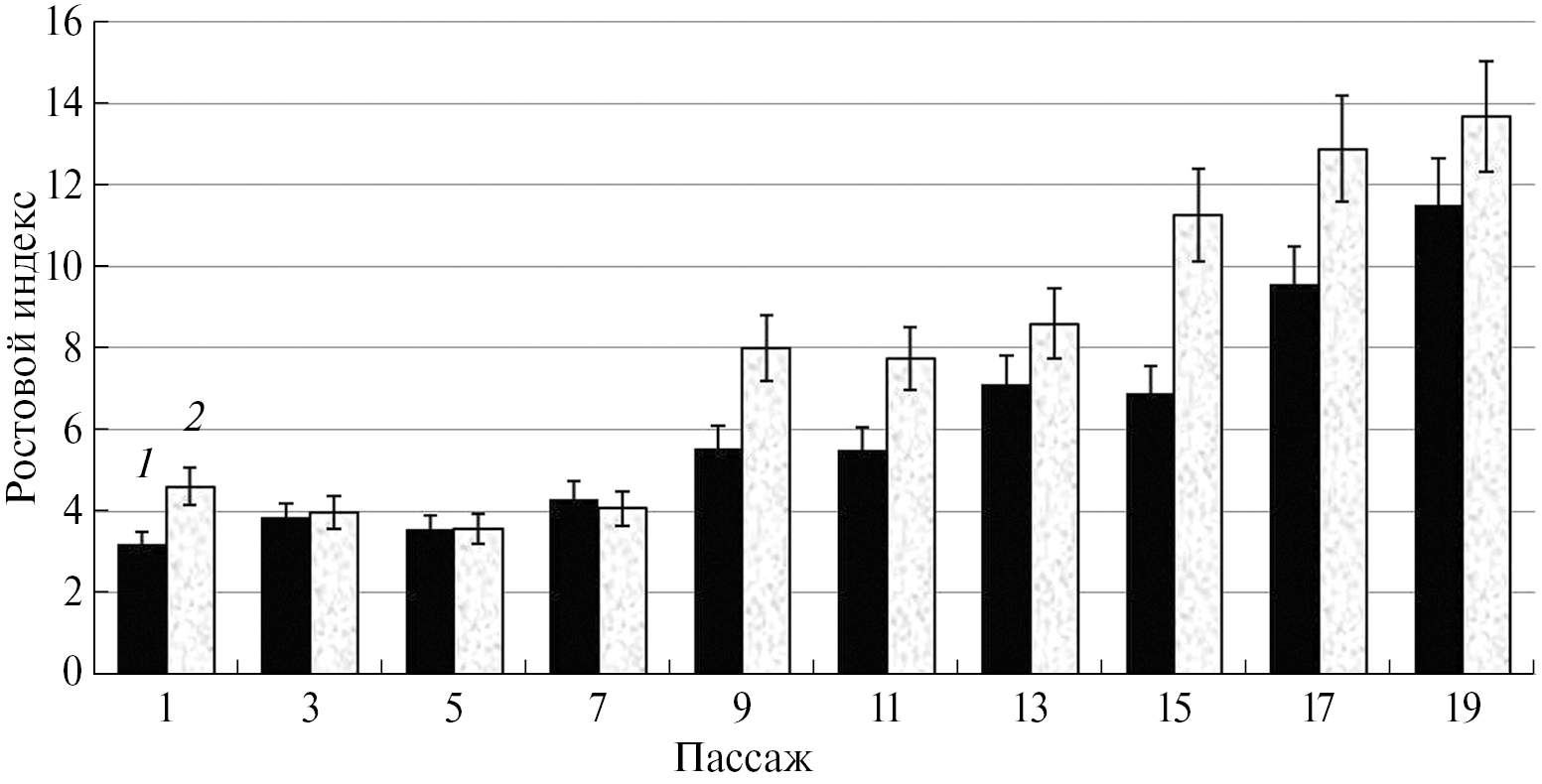 Для каллусных культур мелиссы, полученных из гипокотиля и семядолей, проведен анализ пролиферации каллусов при длительном субкультивировании на протяжении 19 пассажей (рис. 2). В процессе выращивания культур отмечено, что каллусы из разных типов эксплантов в процессе длительного пассирования становились более рыхлыми. Установлено, что в течение первых семи пассажей прирост каллуса существенно не различался. Ростовой индекс при этом не превышал 4.3–4.6, а масса каллуса – 500–550 мг. Начиная с 9-го пассажа, выявлено достоверное увеличение массы каллуса из гипокотилей по сравнению с каллусом, полученным из семядолей. Следует отметить, что в каждом последующем пассаже масса каллусов (в конце цикла выращивания), полученных из разных типов эксплантов, повышалась, а максимальный прирост массы каллусной ткани отмечен в 17–19 пассажах. Ростовые индексы каллусных культур из семядолей и гипокотилей в этот период достигли 13.7 и 11.5 соответственно, что почти в 3.0–3.4 раза выше, чем в 1–7 пассажах. Такое повышение ростовой активности каллусных культур мелиссы, по-видимому, является следствием автоселекции хорошо растущих каллусных линий в пересадочной культуре и оптимальным сочетанием факторов культивирования, способствующим их успешной адаптации к используемым условиям выращивания in vitro. Это свидетельствует о возможности длительного (как минимум, в течение двух лет) пассирования каллусов мелиссы, а также отбора клеток по интенсивности роста, который происходит “скачкообразно” – после 7-го цикла выращивания. Из данных литературы для некоторых видов растений отмечалось, что основные изменения в пассируемых каллусных культурах происходят до 8–12 пассажей [20, с. 259–266]. В частности, улучшение роста каллусных культур при их длительном субкультивировании было выявлено у Alhagi persarum [26]. В.А. Кунах [20, с. 262–266] при анализе изменчивости прироста массы каллусов разных штаммов более десятка видов растений выделил пять основных типов роста. При этом у штаммов 1 типа не наблюдалось существенных изменений роста в течение 24–40 пассажей, тогда как у 2–4 типов изменчивости прироста биомассы в процессе формирования клеточных штаммов происходило снижение биомассы после 1–2 пассажей, а затем повышение этого параметра с различной динамикой в ходе пассажей. Судя по полученным нами экспериментальным результатам, каллусные культуры мелиссы отличались от описанных типов, так как в течение 1–7 пассажей у каллусов из гипокотиля изменений не наблюдали, а у каллусных культур, полученных из семядолей, происходило незначительное повышение ростового индекса. Дальнейшее существенное повышение прироста биомассы в течение изученных 19 пассажей свидетельствует о продолжении процесса формирования штаммов с высокой пролиферативной активностью.