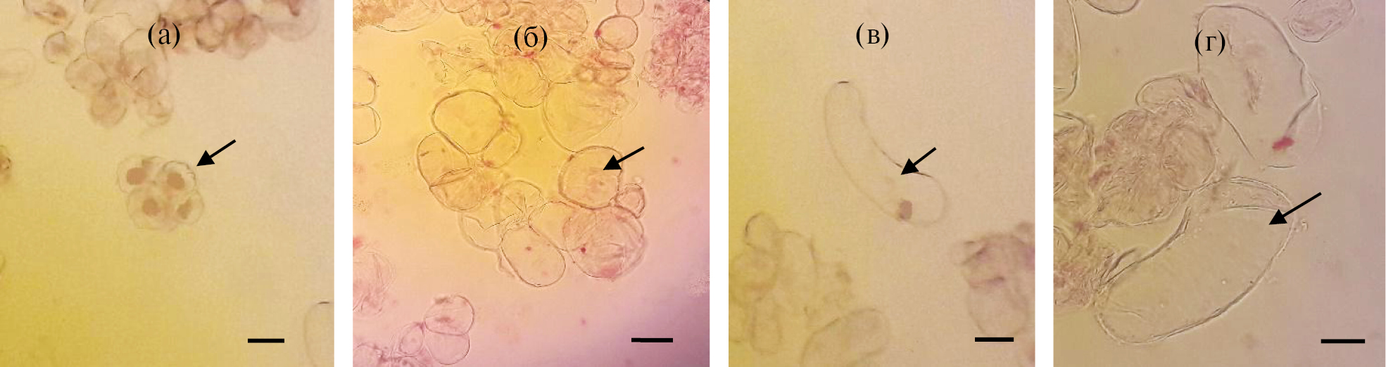 Рис. 3. Типы клеток в каллусной культуре M. officinalis – меристемоподобные (а) и паренхимоподобные клетки: округлые (б), удлиненные (в), гигантские (г). Масштаб: 50 мкм.