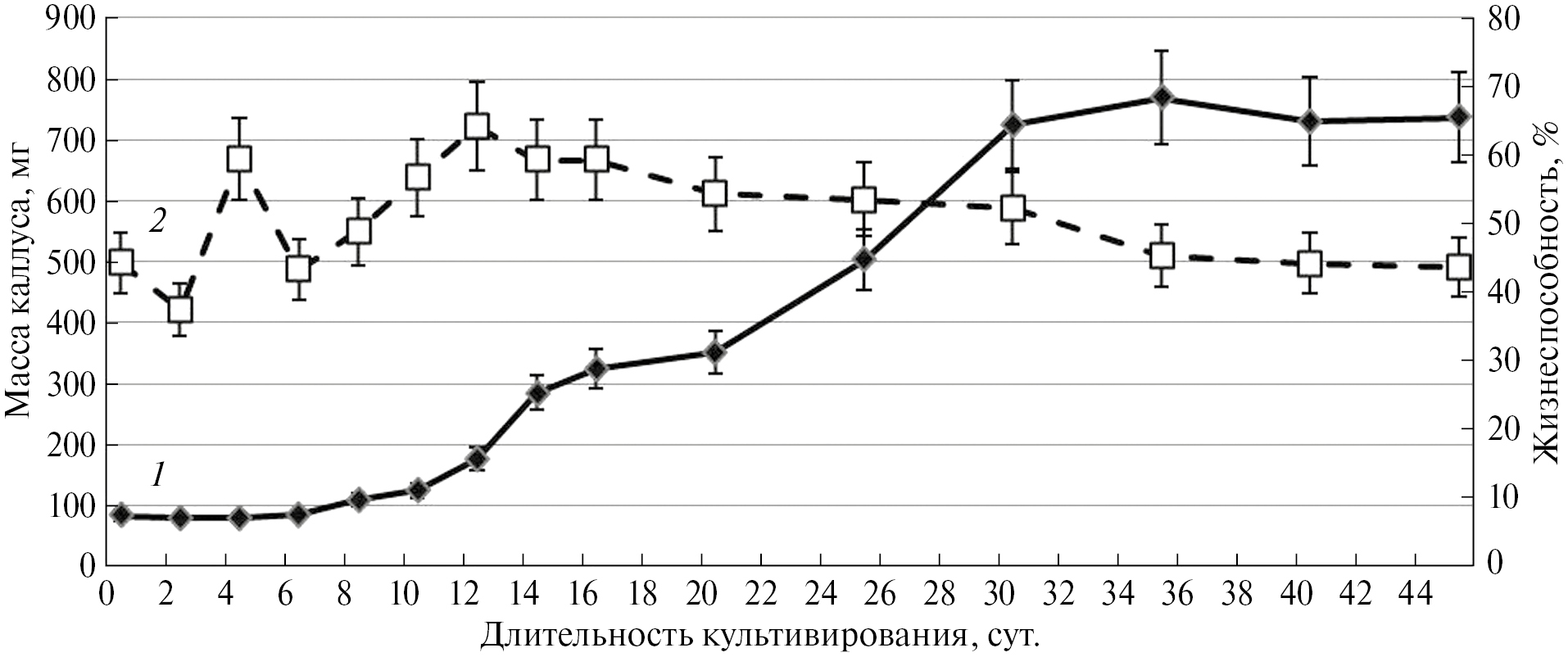 Рис. 4. Динамика изменения массы каллуса и жизнеспособности клеточной популяции в цикле выращивания каллусной культуры M. officinalis. 1 – масса каллуса; 2 – жизнеспособность.
