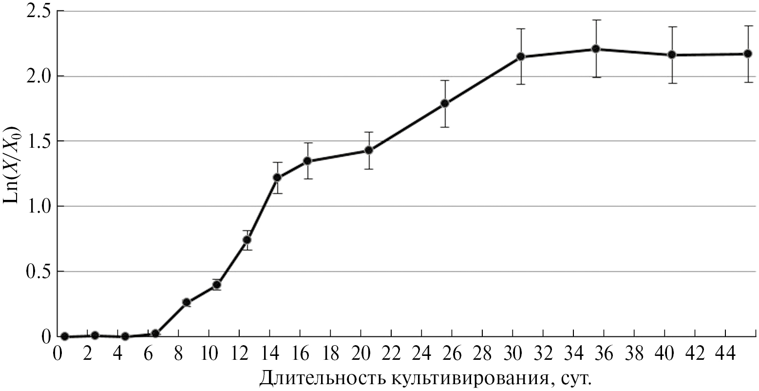 Необходимо отметить “ступенчатый” характер роста каллусной культуры мелиссы – активный экспоненциальный рост с 10 по 14 сут. (линейный участок графика в полулогарифмической системе координат: удельная скорость роста µ = 0.21 сут.–1), затем наблюдали замедление роста с 14 по 20 сут. (µ = 0.05 сут.–1) и последующую активацию роста с 20 по 30 сут. (µ = 0.08 сут.–1). Исходя из данных литературы, такой “ступенчатый” характер роста культуры может быть обусловлен наличием в них субпопуляций клеток с разной интенсивностью роста. Можно предположить наличие как минимум двух клеточных субпопуляций (линий) с разной скоростью пролиферации, что привело к формированию сложной кривой динамики роста, поскольку экспоненциальная фаза одной популяции может накладываться на линейную другой. Отбор в популяциях изолированных клеток в условиях in vitro основан на их высокой генетической вариабельности и различных темпах роста, приводящих по мере культивирования к разному соотношению вариантов с различной пролиферативной активностью [20, с. 231–338]. В качестве примера можно привести анализ прироста сухой биомассы в цикле выращивания миксоплоидного каллусного штамма АЕ-3 Arnebia euchroma, у которой также отмечали два выхода на плато на кривой роста (5–9 и 14–16 сут.) [20, с. 493–495].