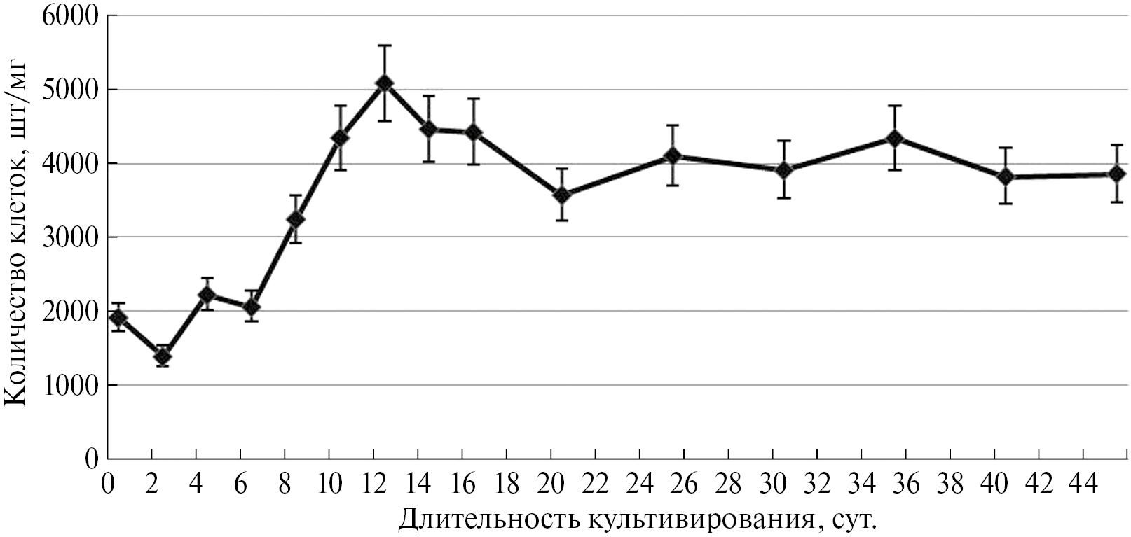 Анализ полученных результатов позволяет заключить, что в исследуемом цикле выращивания в течение первых шести суток культивирования масса каллуса достоверно не увеличилась, отсутствовал видимой рост клеток, что соответствует лаг-фазе ростового цикла. В первые 2–3 сут. этого периода жизнеспособность клеточной популяции снизилась до 37.5% (рис. 4), что, вероятно, связано со стрессовым и/или травматическим действием пересадки и адаптацией популяции каллусных клеток. Следует отметить, что в течение первых шести суток плотность каллуса была минимальной – около 2000 клеток/мг, что почти в 2 раза меньше, чем при последующем культивировании (рис. 6), что обусловлено максимальным числом более крупных паренхимоподобных клеток и, следовательно, их меньшим числом на мг каллуса (рис. 7).