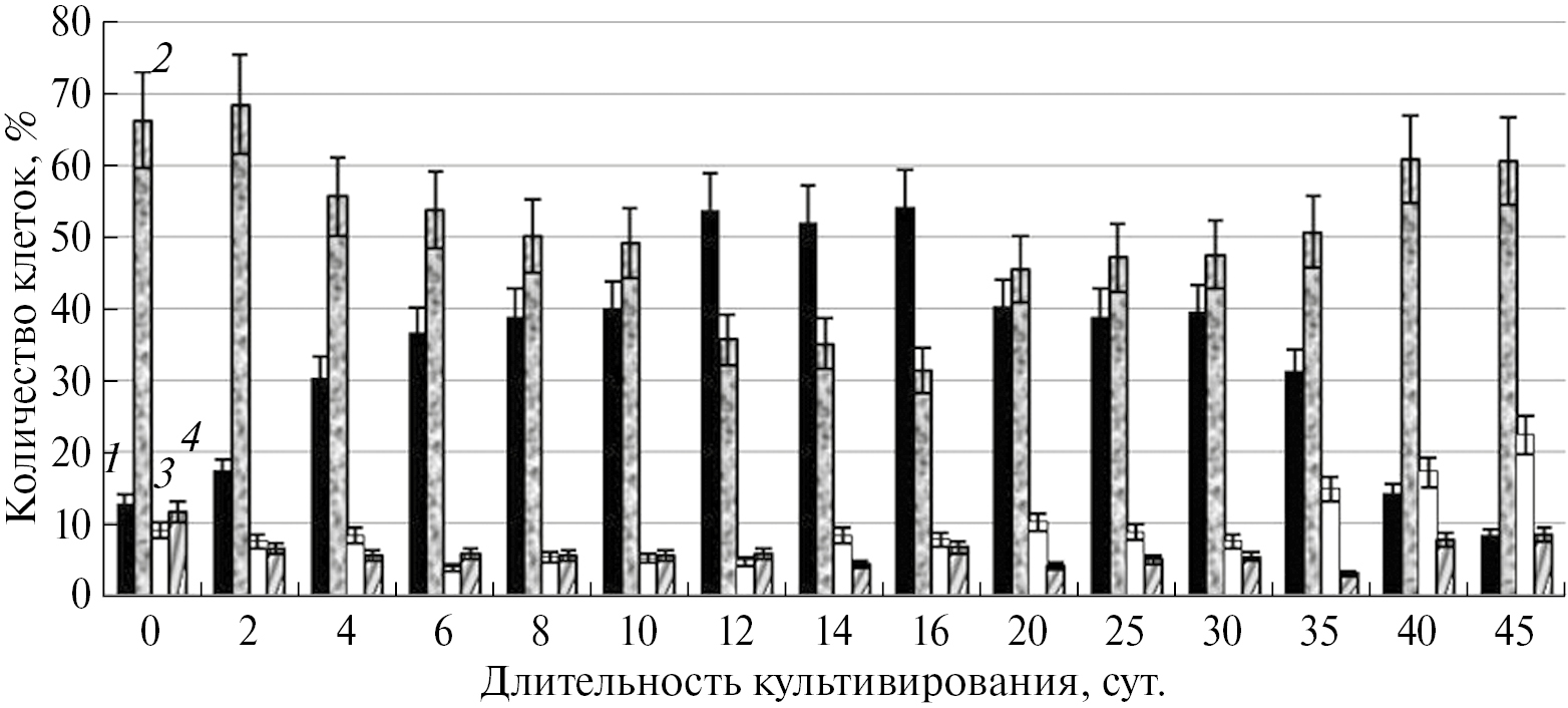 Рис. 7. Динамика изменения соотношения различных типов клеток в цикле выращивания каллусной культуры M. officinalis. 1 – меристемоподобные; 2 – округлые паренхимоподобные; 3 – гигантские паренхимоподобные; 4 – удлиненные паренхимоподобные.