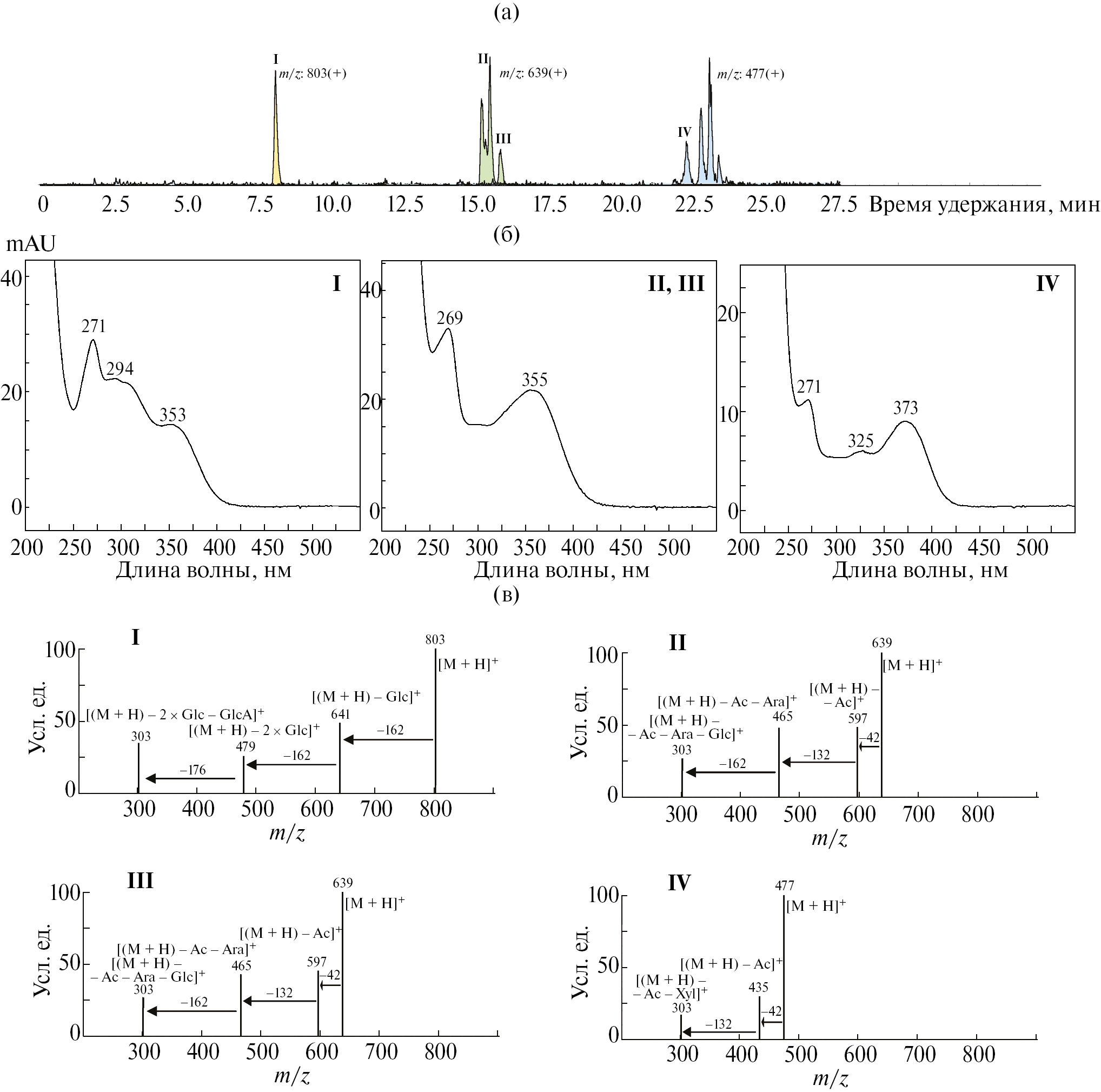 Рис. 1. Хроматограммы экстракта цветков R. algida в режиме выделенных ионов для m/z 803, 639 и 477 (а; расположение новых соединений отмечено цифрами I–IV), спектры поглощения соединений I–IV (б) и масс-спектры соединений I–IV (в). Ac – ацетил, Ara – арабиноза, Glc – глюкоза, GlсA – глюкуроновая кислота, Xyl – ксилоза.