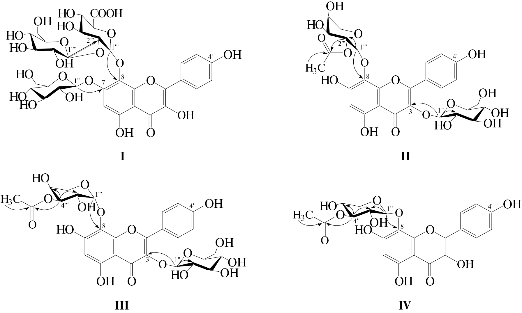 Рис. 2. Строение новых гликозидов гербацетина I–IV. Стрелками указаны ключевые корреляции в спектрах HMBC.