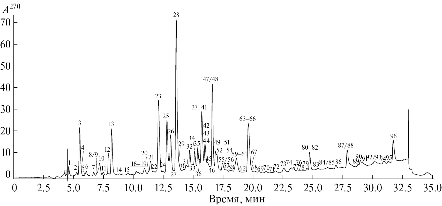 Рис. 3. Хроматограмма (ВЭЖХ-ДМД, λ 270 нм) экстракта цветков R. algida. Номера соединений указаны согласно табл. S1.