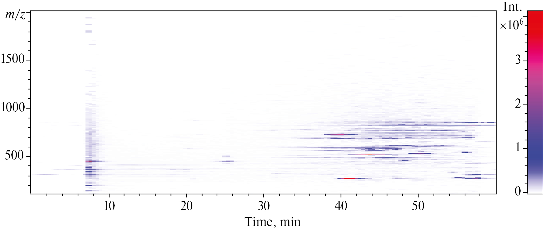 Уточнение состава вторичных метаболитов является чрезвычайно важной задачей в общей системе биохимического анализа. В данной работе был использован метод ВЭЖХ-MС/MС с электрораспылительной ионизацией и анализом фрагментированных ионов. Ниже представлен график, показывающий распределение плотности выхода биологически активных веществ при тандемной масс-спектрометрии анализируемых целевых аналитов экстракта R. japonica (рис. 1). Всего на ионных хроматограммах было обнаружено 300 пиков выделенных целевых аналитов. Для простоты идентификации составлена унифицированная таблица молекулярных масс целевых аналитов, выделенных из экстрактов отдельно листьев и отдельно стеблей R. japonica (табл. 1). При масс-спектрометрическом анализе было предварительно идентифицировано 18 соединений полифенольной группы и 13 соединений других химических групп. Полифенольные соединения, представленные в табл. 1, охватывают практически все классы полифенолов: флавоны, флаванолы, антоцианиновая группа, гидроксибензойные и гидроксикоричные кислоты, халконы, кумарины, лигнаны и т.д.