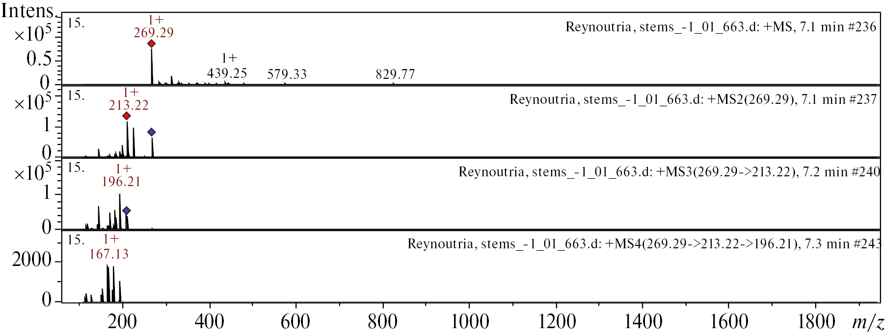 Рис. 4. Масс-спектр формононетина из экстракта стеблей Reynoutria japonica. Вверху МС-скан в диапазоне 100–1700 m/z, внизу спектры фрагментации (сверху-вниз): МС2 протонированного иона формононетина (269.29 m/z, красный ромб), МС3 фрагмента 269.29→213.22 m/z и МС4 фрагмента 269.29→213.22→196.21 m/z.