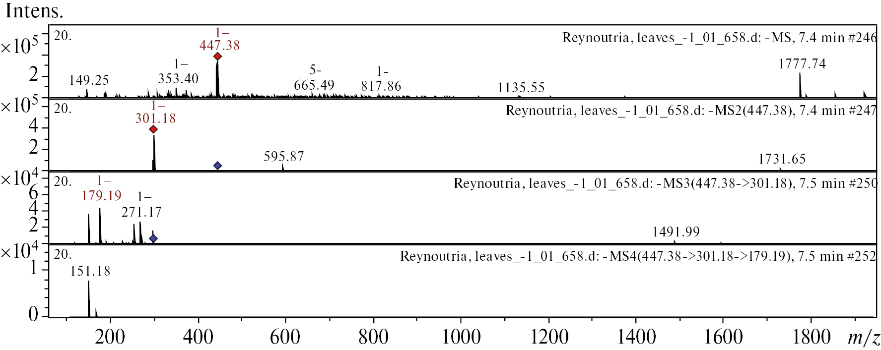 Рис. 5. Масс-спектр кверцитрина из экстракта листьев Reynoutria japonica. Вверху МС-скан в диапазоне 100–1700 m/z, внизу спектры фрагментации (сверху-вниз): МС2 протонированного иона кверцитрина (447.38 m/z, красный ромб), МС3 фрагмента 447.38→301.18 m/z и МС4 фрагмента 447.38→301.18→179.19 m/z.