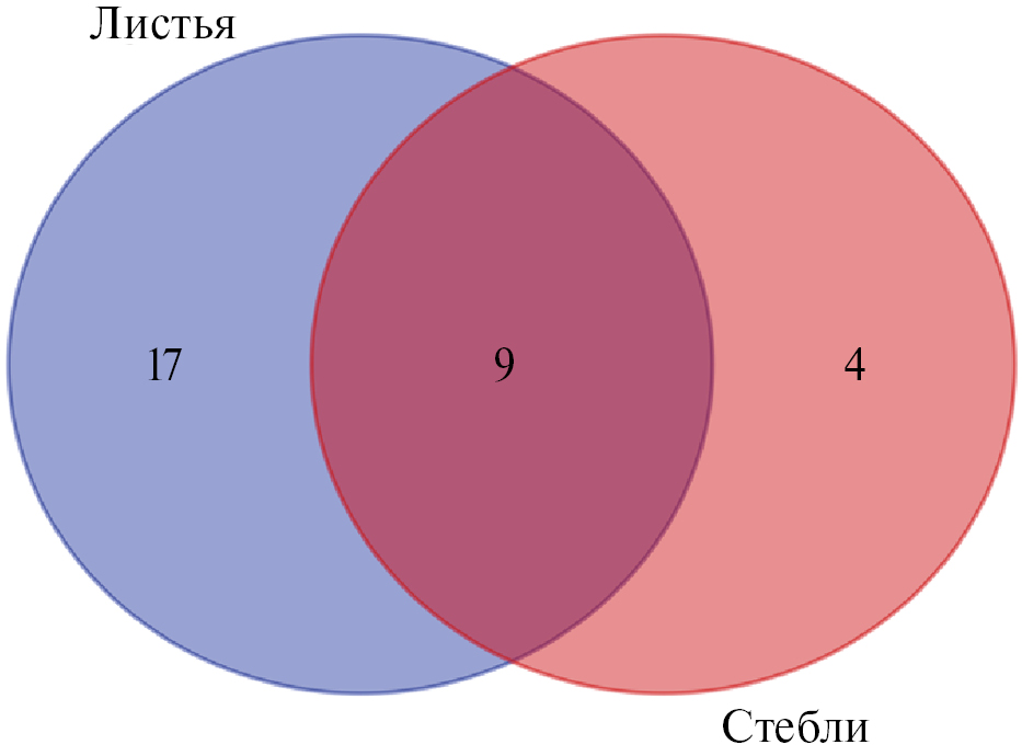 На рис. 6 представлена диаграмма Венна, которая обобщает масс-спектрометрические исследования, представленные выше в табл. 1, и наглядно показывает совпадения и расхождения в обнаруженных химических соединениях отдельно в листьях и стеблях R. japonica. На диаграмме Венна (рис. 6) показано, что присутствует большая степень схожести по химическим соединениям в листьях и стеблях R. japonica. Данные диаграммы Венна расшифрованы в табл. 2, представляющей присутствие тех или иных химических соединений в стеблях и листьях, или отдельно в стеблях и отдельно в листьях.