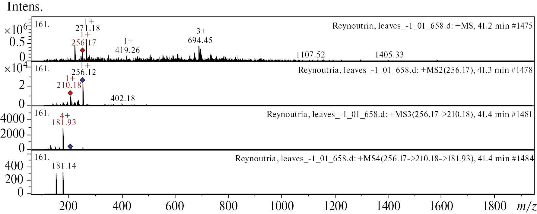 Рис. 7. Масс-спектр 1,4,8 – тригидрокси-антрахинона из экстракта листьев Reynoutria japonica. Вверху МС-скан в диапазоне 100–1700 m/z, внизу спектры фрагментации (сверху-вниз): МС2 протонированного иона 1,4,8 – тригидрокси-антрахинона (256.17 m/z, красный ромб), МС3 фрагмента 256.17→210.18 m/z и МС4 фрагмента 256.17→210.18→181.93 m/z.
