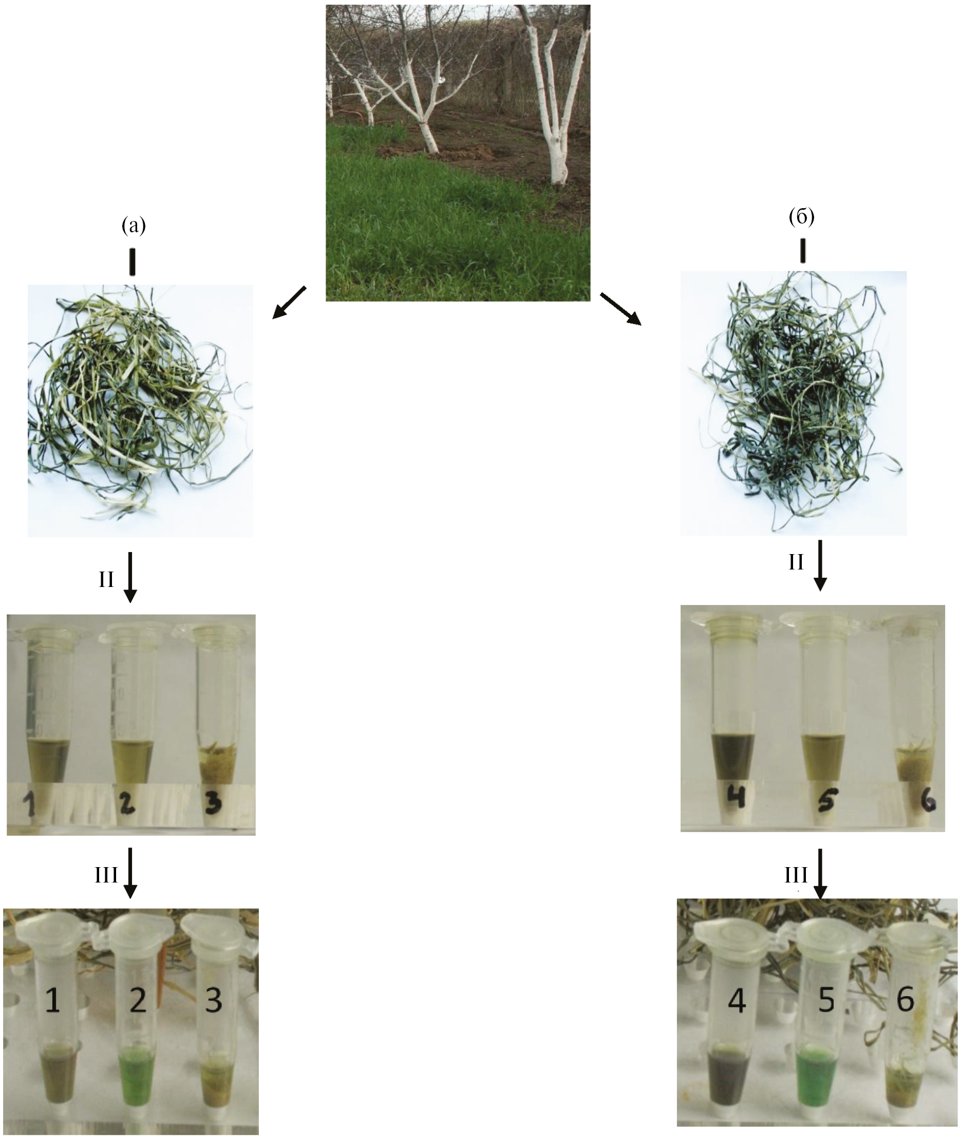 На рис. 1 показана схема синтеза Zn-феофитина в листьях пшеницы и реметаллизации в этаноловом экстракте. Из рис. 1 аII1 и бII4 видно, что интенсивность окраски (концентрация пигментов) этанолового экстракта металлизированного Zn2+ феофитина больше в опыте б. Центрифугирование экстрактов приводит к осаждению агрегатов и мелких фрагментов мембран тилакоидов (рис. 1 аII2 и бII5). Повторная экстракция этанолом этих осадков и осаждение агрегатов центрифугированием свидетельствует об отсутствии пигментов в осадке (рис. 1 аII3 и бII6).