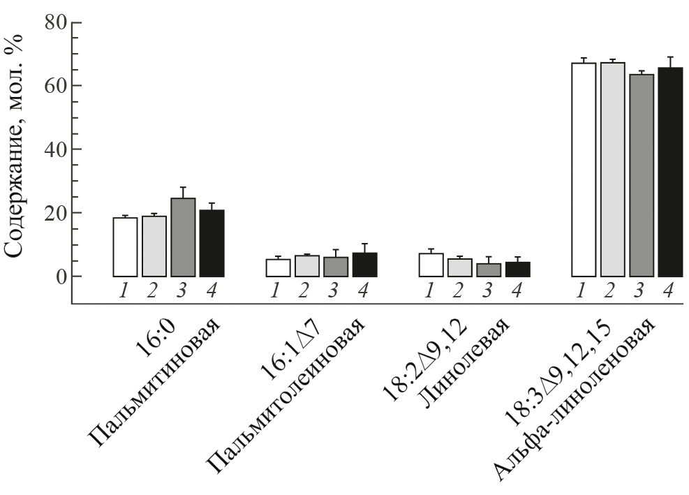 Рис. 2. Жирнокислотный состав листьев мягкой пшеницы Саратовская-60 и трансгенных линий с конститутивной экспрессией гена AtOPR3 (1 – Sar-60, 2 – Tr-3, 3 – Tr-18, 4 – Tr-20). Жирные кислоты обозначены с использованием тривиальных названий и дельта-номенклатуры, указывающей число углеродных атомов в жирнокислотной цепи, число двойных связей после двоеточия и положение этих двойных связей после знака “Δ”. Данные представляют собой средние значения ± стандартное отклонение.