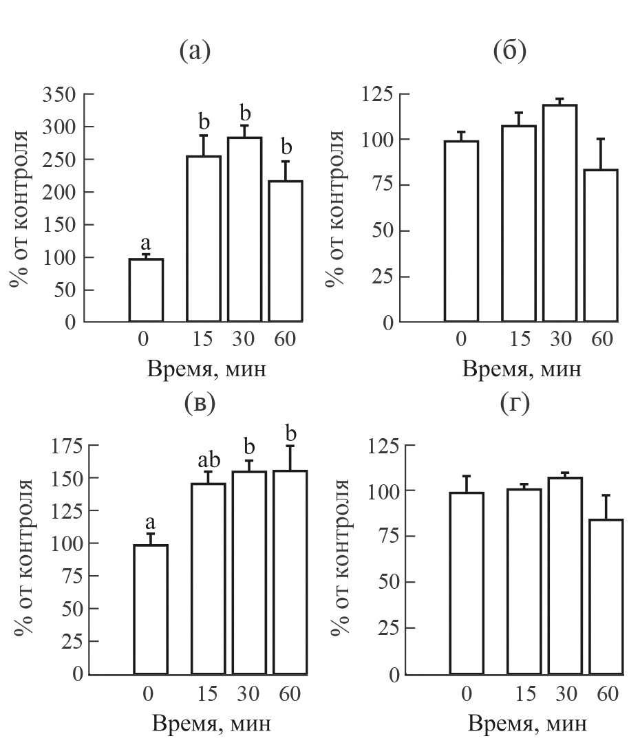 Рис. 4. Изменение содержания индивидуальных оксилипинов HPL ветви, цис-3-гексеналя (а), транс-2-гексеналя (б), цис-3-гексенола (в) и цис-3-гексенил ацетата (г), в пораненных листьях мягкой пшеницы Саратовская-60 в течение часа после повреждения. Эндогенное содержание метаболита до повреждения листа принято за 100%. Буквы обозначают статистически значимые различия между линиями, согласно оценке однофакторного дисперсионного анализа (ANOVA) с последующим пост-хок тестом Тьюки (Р ≤ 0.05).