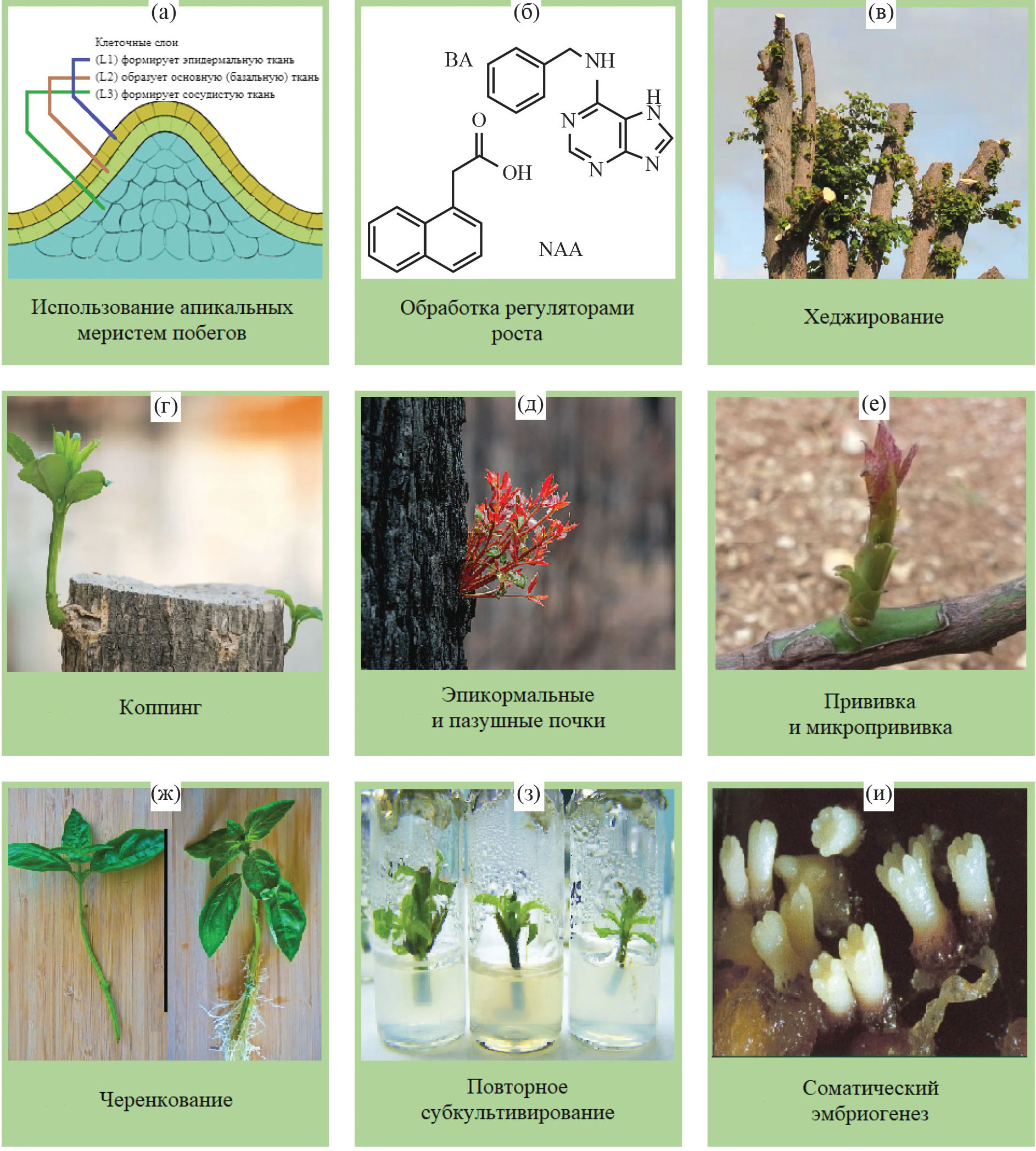 Омоложение растений происходит за счет перепрограммирования клеток или регулирования факторов окружающей среды. Перепрограммирование клеток, с одной стороны, потенциально достижимо путем стимуляции существующих эмбриональных стволовых клеток в растениях, используемых для получения ювенильных растений. С другой стороны, в зависимости от тотипотентности растительных клеток, дифференцированные клетки могут быть индуцированы сначала к дедиференциации с последующей новой дифференциацией и, в конечном итоге, к формированию растений-регенерантов [24]. На репродуктивную жизнеспособность также влияют факторы окружающей среды, такие как фотопериод, интенсивность света, температура и доступность воды [25]. Обращение старения (возврат к более ранним стадиям развития) может быть достигнуто с помощью различных искусственных способов, которые продемонстрировали возможность стимулировать ювенилизацию у зрелых (не ювенильных) растений, не поддающихся обычным (традиционным) методам вегетативного размножения (рис. 1) [20, 26]. Среди этих способов известна сильная обрезка (хеджирование); использование прикорневых (пневых) побегов и коппинг эпикормальных побегов и материала ювенильных частей взрослых растений; использование (выгонка) побегов из придаточных почек; прививка взрослых черенков на молодые подвои; последовательная многократная прививка; обработка взрослых растений или их частей химическими веществами, регулирующими рост; удаление листьев со взрослых деревьев, что приводит к элиминации ингибирования процесса укоренения; использование различных методов размножения in vitro [27–30]. Методы in vitro включают в себя культивирование выбранных (тщательно отобранных) эксплантов, такие как культивирование меристем, повторное субкультивирование, микропрививка на ювенильные укорененные побеги, образование адвентивных почек в культуре органов, органогененез, соматический эмбриогенез и перенос генов [1, 31]. Далее остановимся на ряде основных из перечисленных методов.