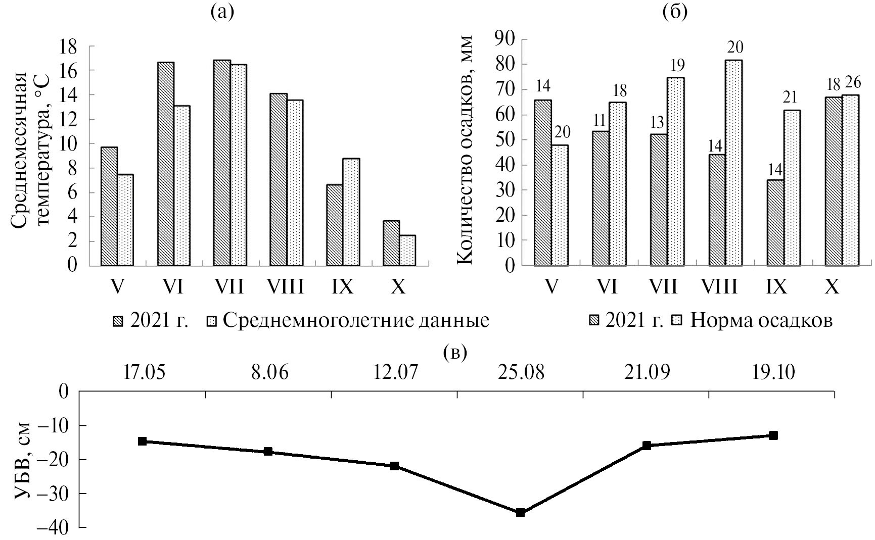 В начале вегетационного сезона (май-июнь) 2021 г. среднемесячная температура воздуха заметно превысила среднемноголетние значения, кроме того, количество выпавших в мае осадков оказалось выше нормы. В оставшиеся летние месяц (июль-август) среднемесячная температура была приближена к среднемноголетним значениям, однако количество осадков, выпавших за месяц, вплоть до сентября было ниже нормы. Сентябрь оказался единственным месяцем за рассматриваемый период, когда среднемесячная температура оказалась ниже среднемноголетнего значения. Средняя температура октября 2021 г. была выше среднемноголетнего значения, а количество осадков, выпавших за этот месяц, соответствовало норме. Число дней с осадками за каждый месяцев было значительно ниже среднемноголетнего числа дней с осадками. Уровень болотных вод (УБВ) на исследуемой территории демонстрирует тенденцию к снижению от мая к августу, месяцу с минимальным УБВ (–35.8 см), и дальнейшее увеличению к октябрю. В начале и в конце вегетационного сезона УБВ был примерно одинаков и составил –14.7 см в мае и –13 см в октябре (рис. 1).