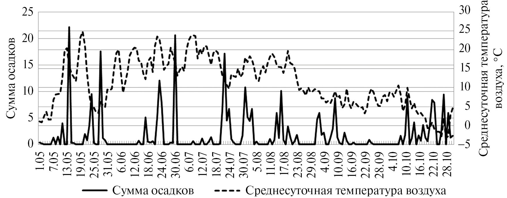 Объединение диаграмм, отражающих среднесуточные температуры воздуха и суммы осадков, позволяет отметить на получившемся графике сочетание периодов с высокой среднесуточной температурой и довольно продолжительных периодов с малым или нулевым количеством осадков, распределенных неравномерно в ходе вегетационного сезона 2021 г. (рис. 2).