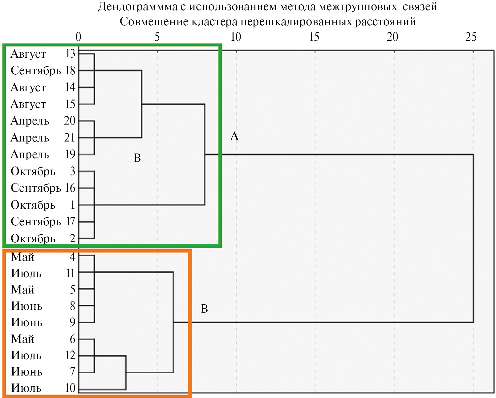 Рис. 3. Дендрограмма сходства показателей адаптации мха к сезонным условиям освещенности (соотношение хлорофиллов a/b, доля хлорофилла в ССК) в сезонной динамике. A, B – выделенные кластеры.