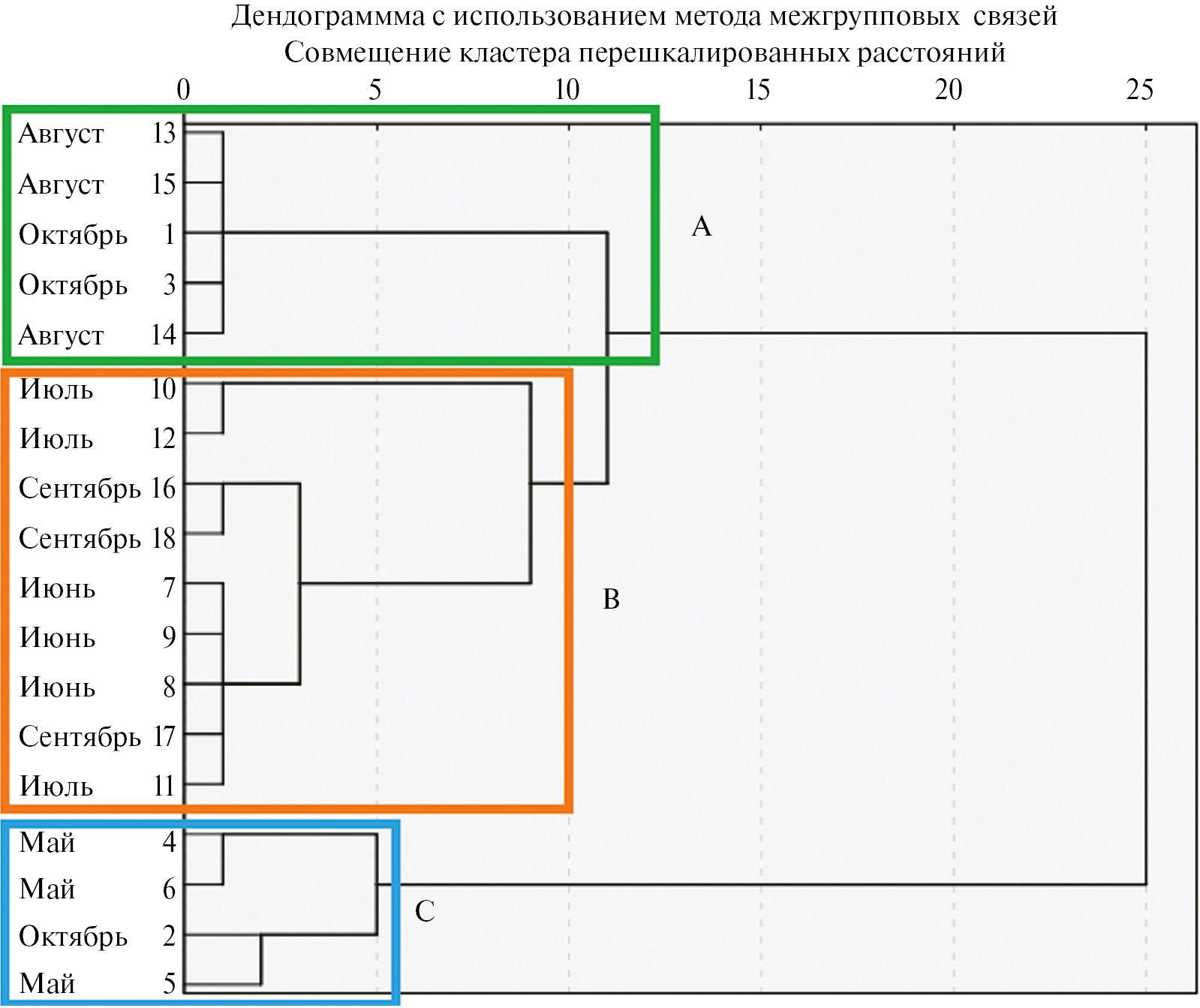 Рис. 4. Дендрограмма сходства показателей адаптации мха к режиму атмосферного увлажнениям (соотношение Хл/ Кар, количество осадков). А, B, C – выделенные кластеры.