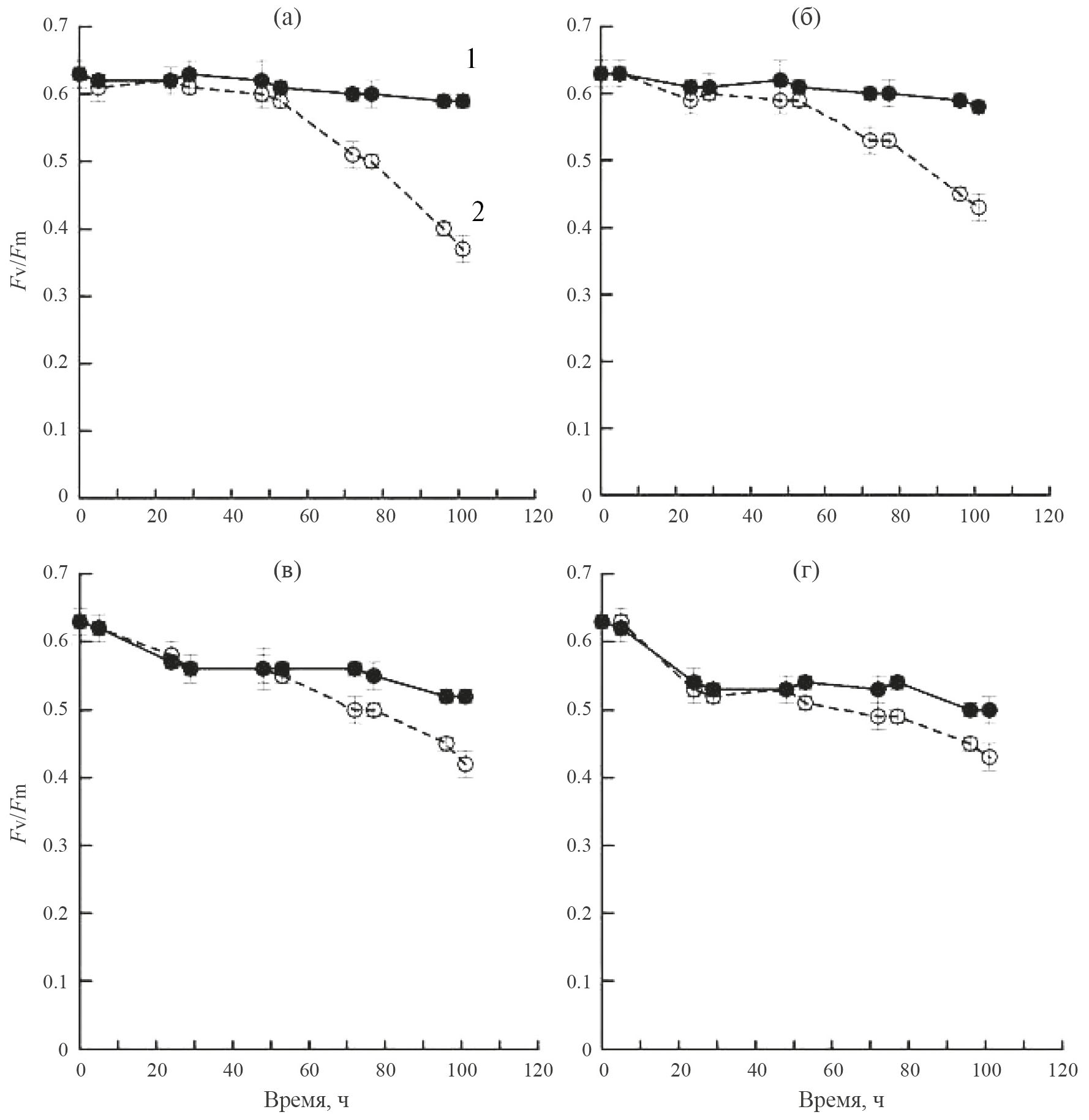 Рис. 3. Динамика максимальной эффективности фотосистемы II (Fv/Fm) под влиянием вирусной инфекции: 1 – неинфицированные клетки; 2 – инфицированные клетки; а – полная среда f/2; б – среда без азота; в – среда без фосфора; г – морская вода без биогенных элементов.