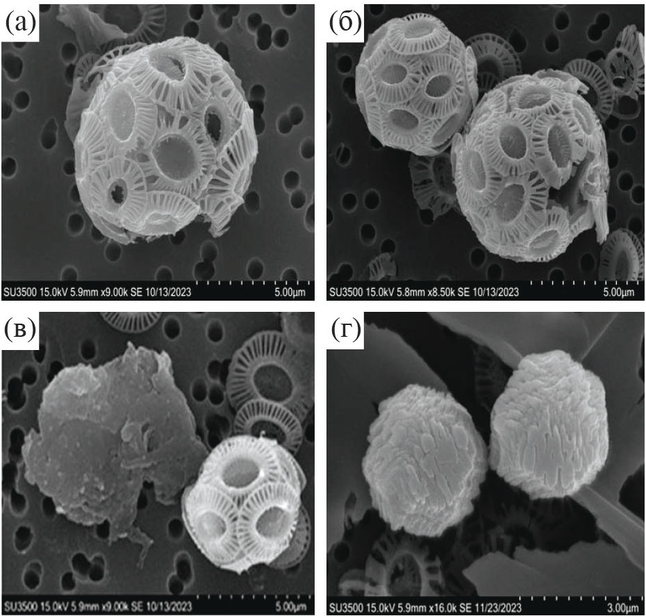 Рис. 4. Сканирующая электронная микроскопия клеток Emiliania huxleyi на различной стадии поражения вирусной инфекцией: а, б – ранняя стадия; в – поздняя стадия; г – “голые” клетки.