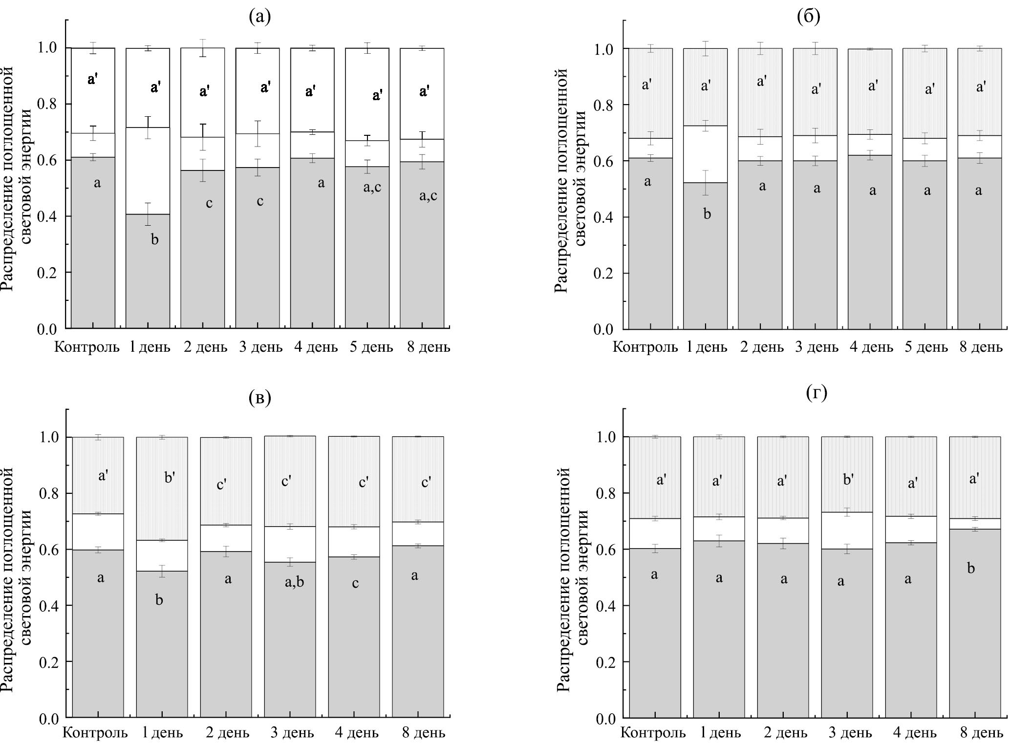 На рис. 1 представлены гистограммы показателей эффективности ФС II в ответ на действие лантана и иттербия. В листьях контрольных растений во всех вариантах величина эффективного квантового выхода флуоресценции хлорофилла (Y(II)) была на уровне 0.6 ± 0.01, а значения (Y(NPQ) и (Y(NO)), соответственно, равнялись 0.1 ± 0.03 и 0.3 ± 0.02. Через 24 ч после обработки листьев La(NO3)3 в концентрации 100 мкмоль отмечалось снижение величины Y(II) до 0.41, в то время как вклад Y(NPQ) увеличился с 0.1 до 0.31. Вклад Y(NO) незначительно снизился с 0.30 до 0.28 (рис. 1a). Восстановление уровня Y(II) до начального (контрольного) значения отмечалось только на четвертые сутки после обработки. При уменьшении дозы La(NO3)3 в 10 раз отмечалась схожая картина, однако значение Y(II) на следующий день после обработки снизилось до 0.5 ± 0.04, значение Y(NPQ) выросло на 0.13, а восстановление уровня Y(II)) до начального (контрольного) значения произошло уже на второй день (рис. 1б).