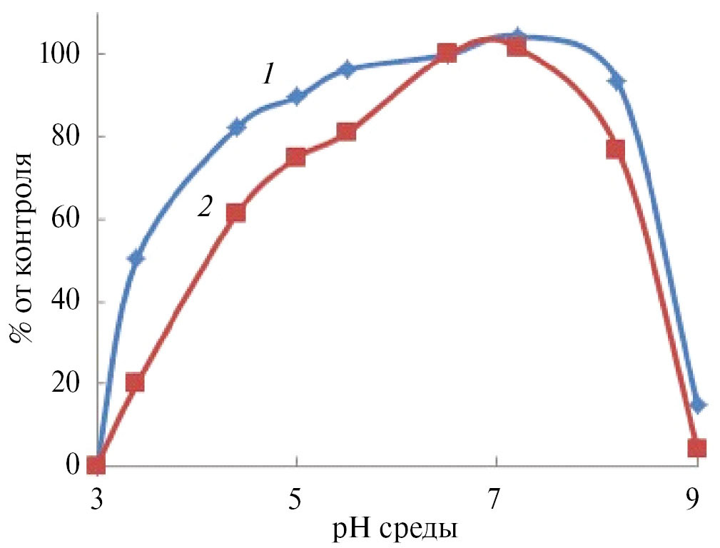 Рис. 1. Влияние pH среды на прорастание пыльцы и рост пыльцевых трубок ели in vitro: 1 ‒ жизнеспособность пыльцы; 2 ‒ средняя длина пыльцевой трубки.