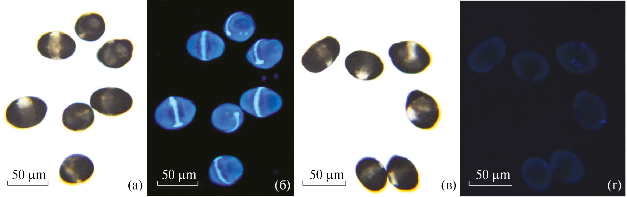 Рис. 2. Характер флуоресценции пыльцевых зерен ели при окрашивании калькофлуором: а, б – пыльца после 3-часовой гидратации в водной суспензии; в, г – не гидратированная пыльца; а, в – проходящий белый свет; б, г – флуоресценция в УФ-свете.