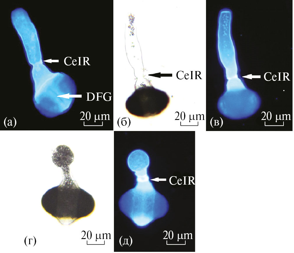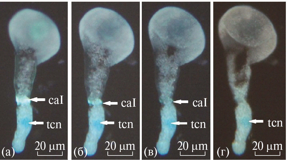 В течение первых 12–14 ч после высева пыльцы ели на питательную среду происходила гидратация пыльцевых зерен. В это время пыльцевые зерна выделяют АТФ, необходимую для инициации прорастания пыльцы и роста пыльцевых трубок во внеклеточный матрикс [35, 36]. В это же время в пыльцевых зернах происходит интенсивный синтез целлюлозы. При окрашивании калькофлуором пыльцы ели, гидратированной в течение 2–3 ч в водной суспензии, проявлялась яркая флуоресценция в виде узкой полосы в меридиональной плоскости по обе стороны внутренней поверхности оболочки пыльцевого зерна (в интине), перпендикулярно дистальной борозде прорастания. Это полузамкнутое кольцо имело разрыв в проксимальной зоне пыльцевого зерна (рис. 2а, б). В наших опытах при окрашивании гидратированных пыльцевых зерен ели анилиновым синим флуоресценция в них отсутствовала. При окрашивании калькофлуором не гидратированной пыльцы флуоресценция также не наблюдалась (рис. 2г).