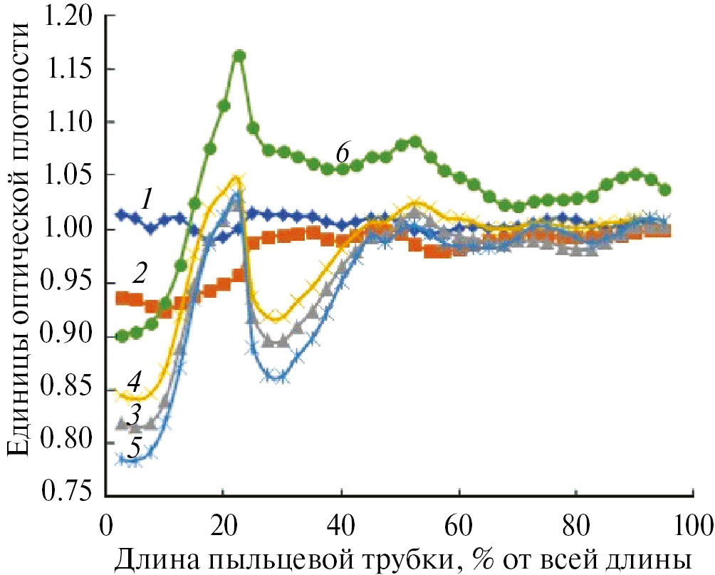 Содержание белков, аминокислот, РНК, ДНК, липидов и полисахаридов по градиенту длины пыльцевых трубок у ели довольно лабильно, постепенно возрастало по направлению к растущему кончику, и стабилизировалось по достижении примерно половины их максимальной длины. Общее содержание углеводов в пыльцевых трубках у ели по градиенту длины почти не менялось (рис. 5).