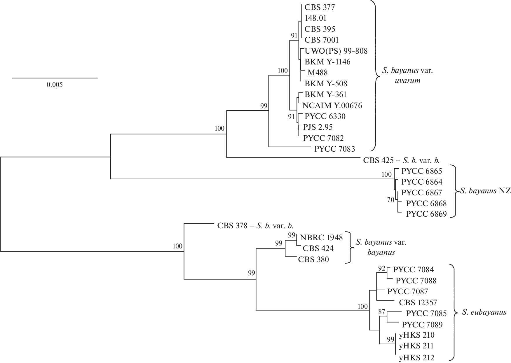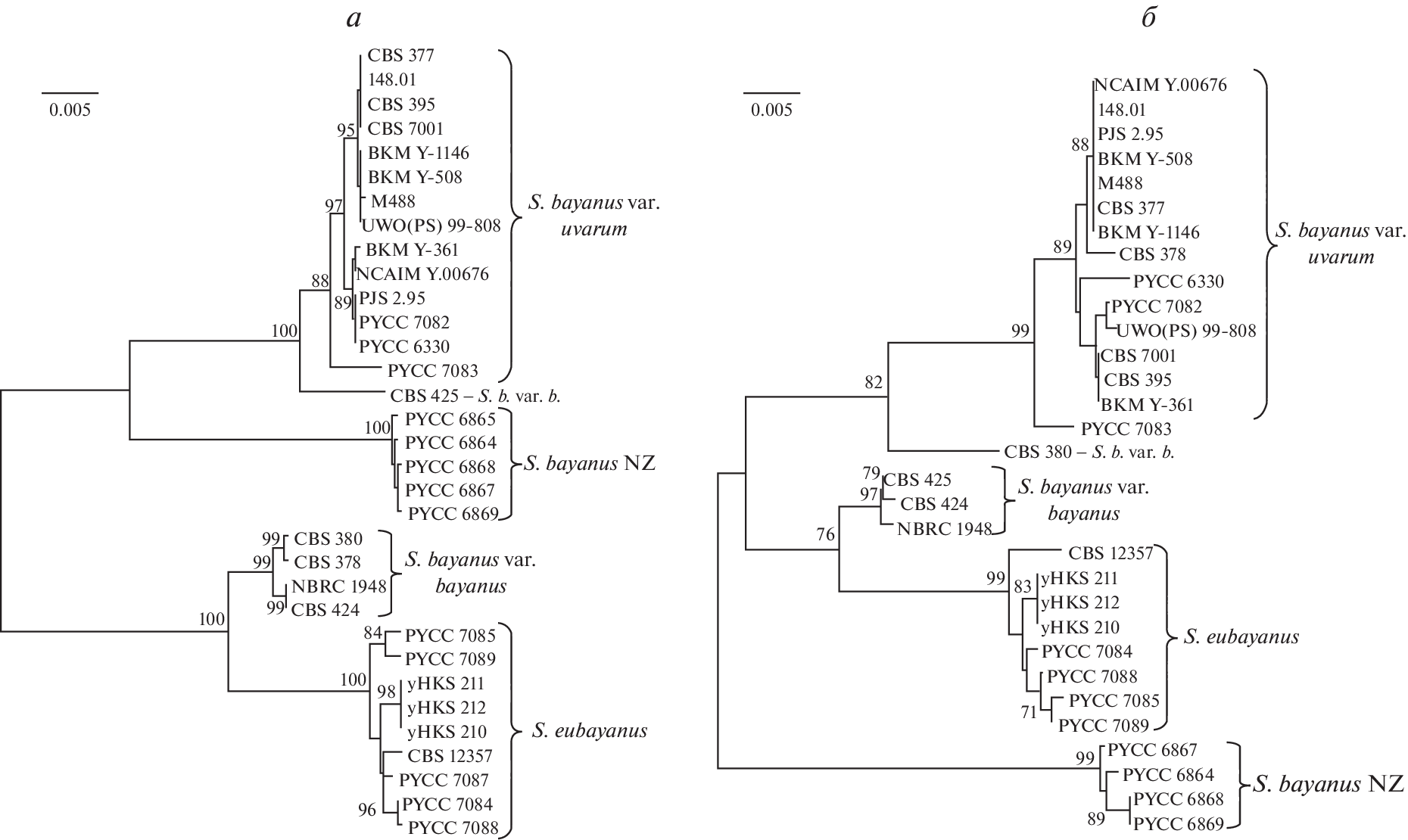 The genetic relatedness of yeasts in the Saccharomyces bayanus complex has been studied using the methods of molecular and classical genetics. A divergent population of S. bayanus has been found in New Zealand and Australia. The S. bayanus complex includes four genetic populations: S. bayanus var. bayanus, S. bayanus var. uvarum, S. eubayanus and New Zealand population. The strains of the New Zealand population differ significantly in the nucleotide sequences of nuclear (FSY1, HIS3, MET2) and mitochondrial (FUN14, COX2) genes and form semi-sterile hybrids with other populations: viability of ascospores is 6.2–23.3%. There is no complete interspecific postzygotic isolation between S. bayanus var. bayanus, S. bayanus var. uvarum, S. eubayanus, and New Zealand populations: all hybrids showed regular meiotic segregation of control auxotrophic markers. According to the results obtained, four genetic populations belong to the same biological species with genomic divergence at the level of taxonomic varieties.