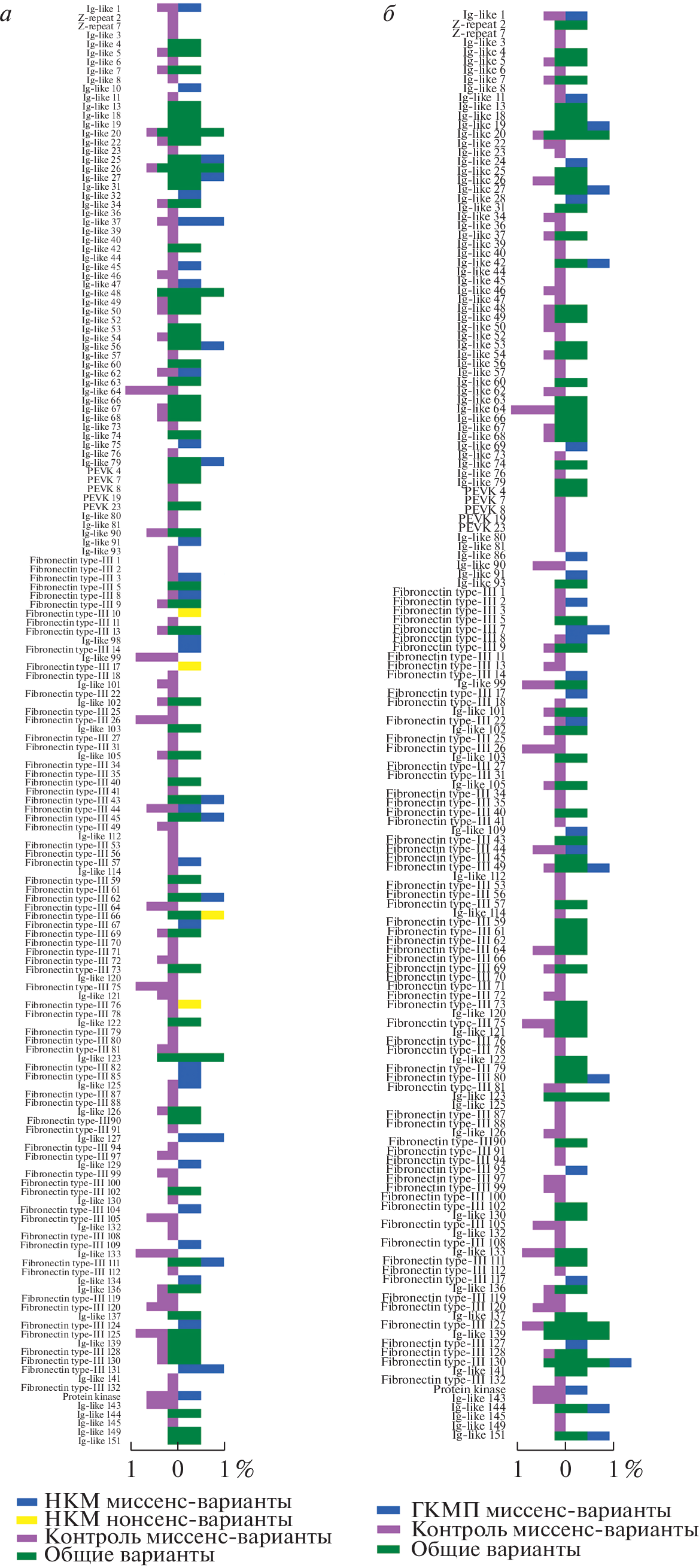 Using NGS, the coding sequence of the TTN gene was sequenced in patients with left ventricular non-compaction cardiomyopathy (LVNC, 44 individuals) and hypertrophic cardiomyopathy (HCM, 74 individuals), as well as in the control (194 individuals), and 9 nucleotide variants leading to truncated titin (TTNtv) and 372 missense variants were identified. A comparative analysis of the genetic variability of titin between the groups of patients with LVNC and HCM and the control sample was carried out in terms of the type of mutations and their localization in the exons of genes, as well as in the sarcomeric and functional domains of the protein. The role of TTNtv in the development of LVNC was confirmed, and the significance of additional variants in the same gene or in other genes associated with various cardiomyopathies for the phenotypic implementation of TTNtv was demonstrated. 75% of patients with TTNtv had a dilated LVNC phenotype. Missense substitutions in the TTN gene were found both among the patients with LVNC and HCM, and in people in the control sample, which indirectly confirms that most missense variants in this gene are benign. The paper identifies and lists highly mutable and conserved exons of the TTN gene and also presents a list of missense mutations with possible clinical significance in relation to the structural pathology of the myocardium, including new variants. It was shown that the majority of pathogenic and potentially significant mutations were located in the A-zone of the sarcomere. In all the groups, about 30–50% of new variants were identified. Probably, many of them are neutral and are of exclusively population interest.