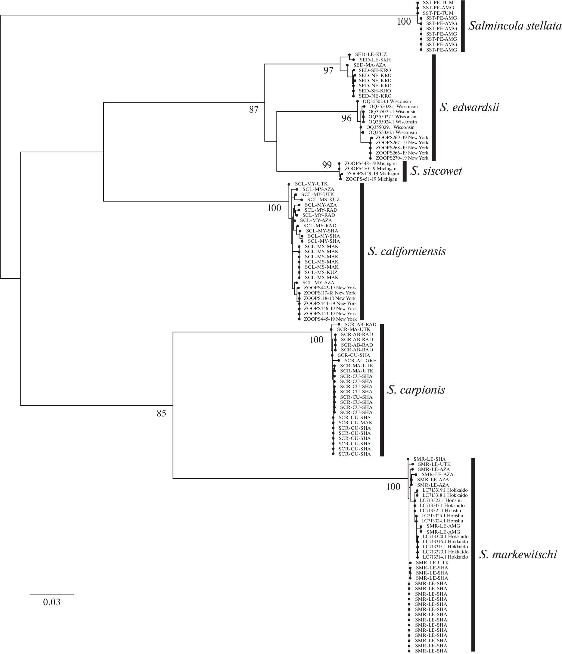 Штрихкодовый фрагмент гена COI секвенирован у 91 образца пяти видов паразитических копепод Salmincola, снятых с лососевых рыб в основном c Дальнего Востока России (ДВР): S. californiensis (микижа и сима) и S. edwardsii (различные виды гольцов, нерка из оз. Кроноцкое), S. carpionis (различные виды гольцов), S. markewitschi (кунджа), S. stellata (сахалинский таймень). Всего был найден 41 вариант гаплотипов с максимальным уровнем различий 0.183 нуклеотидных замен на позицию. Расстояние между видами варьировало от 0.139 ± 0.014 (в паре S. markewitschi–S. carpionis) до 0.179 ± 0.015 (в паре S. stellata–S. californiensis). Внутривидовое нуклеотидное разнообразие фрагмента гена COI намного ниже и составило для S. californiensis и S. edwardsii, населяющих жаберную полость и плавники хозяина – 0.013 ± 0.003 и 0.015 ± 0.003, а для S. stellata, S. markewitschi и S. carpionis, локализующихся в ротоглоточной полости хозяев – 0.002 ± 0.001, 0.004 ± 0.001 и 0.005 ± 0.001 соответственно. Сравнение выборок трех видов копепод Salmincola из разных районов ДВР выявило существенную (Fst = 0.28–0.42, P \( \ll \) 0.001) генетическую подразделенность. Три субклады edwardsii-подобных копепод – S. edwardsii с ДВР, S. edwardsii с американской ручьевой палии востока Северной Америки и S. siscowet с озерной палии штата Мичиган (COI-последовательности копепод из последних двух групп взяты из генетических баз данных) – различались между собой в среднем по 9.3–10.9% нуклеотидным позициям, что указывает на необходимость таксономической ревизии S. edwardsii. Согласно проведенному молекулярному датированию дивергенция линий Salmincola началась в миоцене и завершилась в раннем плиоцене. Филогенетическая скорость составила 0.023 (95%-ный интервал: 0.013–0.033) нуклеотидных замен на позицию на млн лет на линию. Скорость нуклеотидных замещений на популяционном уровне оказалась в 3.7 раза выше – 0.085 (0.021–0.170). Высокий уровень изменчивости фрагмента гена COI делает этот маркер удобным инструментом как для разработки систематики и филогении копепод Salmincola и Lernaeopodidae на видовом и родовом уровнях, так и для анализа дифференциации их популяций.