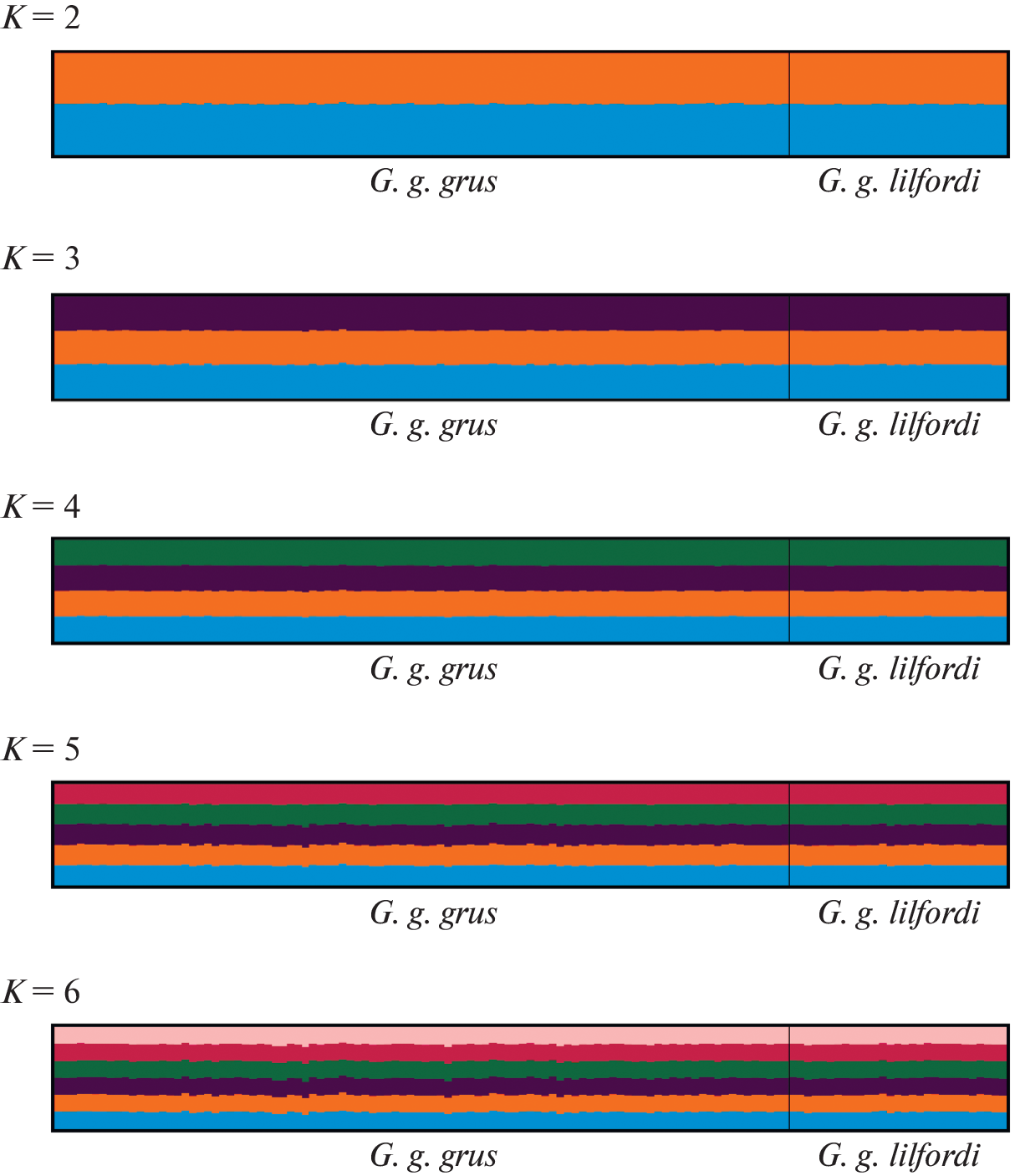 The article presents an extended (as compared with our previous studies) analysis of the population genetic structure of a migratory wide-range bird species with a high abundance, the Eurasian Crane Grus grus L. Using seven highly polymorphic microsatellite loci, high and very similar values of genetic diversity parameters were obtained in the samples of both the western (G. g. grus) and eastern (G. g. lilfordi) subspecies. Coefficients of genetic differentiation between these subspecies (FST = 0.008, GST = 0.002) were also found to be low. According to AMOVA, 99% of genetic variation of G. grus is attributed to individual levels. Using the Bayesian clustering algorithm implemented in STRUCTURE software, no clear population-genetic structuring of the species was revealed. However, visualization of spatial patterns of genetic variability in Geneland showed the presence of a cluster of “pure” subspecies G. g. grus and G. g. lilfordi surrounding a cluster of individuals from the zone of intergradation of these subspecies. This result, along with the observed very low FST values, may indicate subtle genetic differences between cranes from the studied area, possibly having a mutational nature. The lower allelic richness and lack of private alleles in the eastern subspecies suggest that G. g. lilfordi is relatively evolutionary young and suggest its recent origin from some eastern marginal populations of the nominative western subspecies.