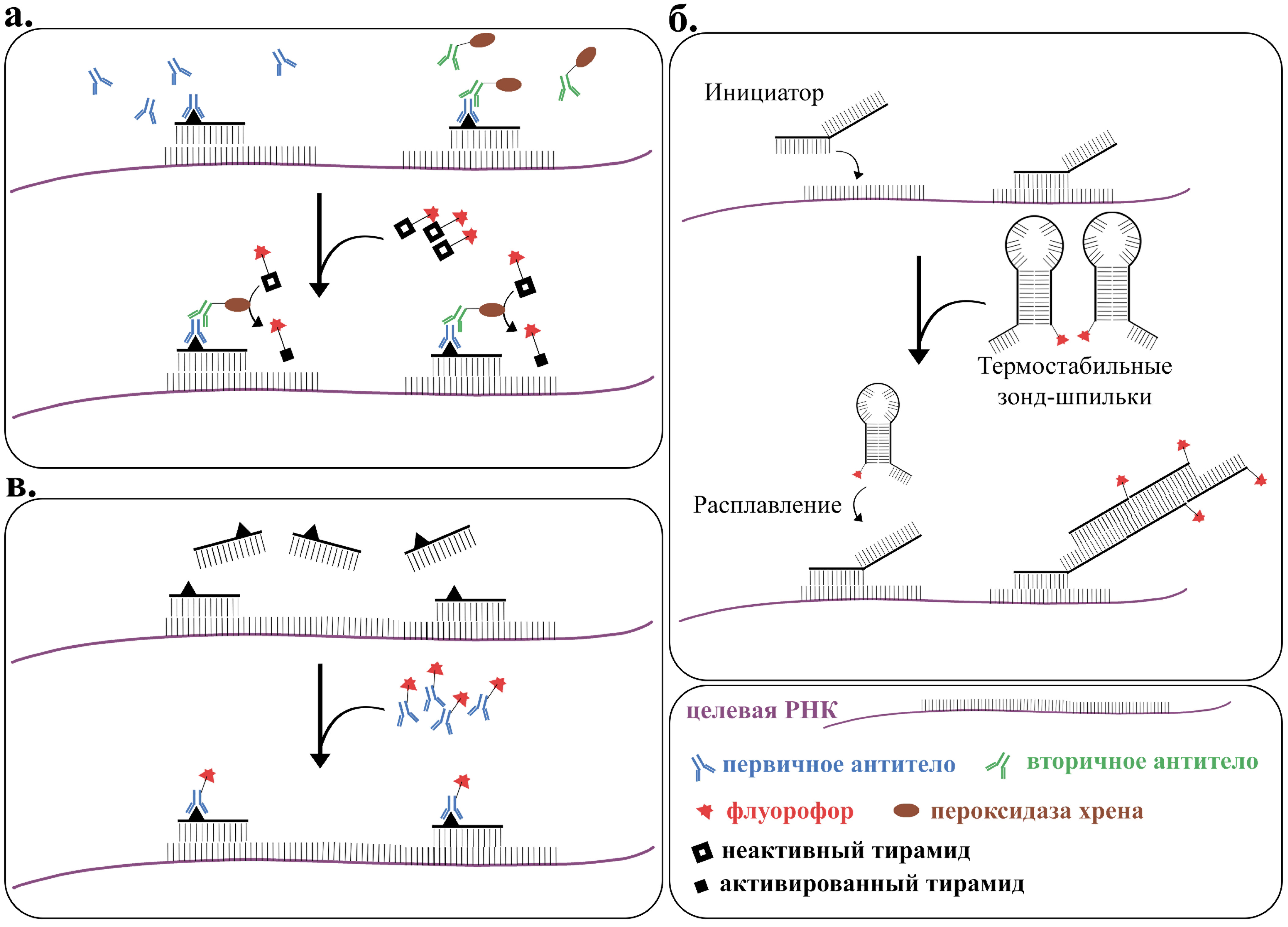 Существуют технологии амплификации сигнала с “открытым” принципом работы. Так, используются тирамид-сигнальная амплификация (Рис. 2, а) [22, 23], цепная реакция гибридизации in situ (Рис. 2, б) (hybridization chain reaction) [24], дигоксигенин-меченные зонды [25, 26] с последующей визуализацией флуоресцентно меченных антител к дигоксигенину (также и к другим гаптенам типа биотина) (Рис. 2, в) [27, 28]. Для каждого из этих методов проводятся постоянное усовершенствование и разработка новых протоколов, в том числе и мультиплексирования [29, 30]. Разработаны рекомендации по хранению биоматериала, подлежащего гибридизации РНК in situ, для получения достоверных результатов в ретроспективных исследованиях [31]. Несмотря на то что методы обладают отдельными модификациями, принцип работы – гибридизация нуклеиновых кислот – остается единым [11].