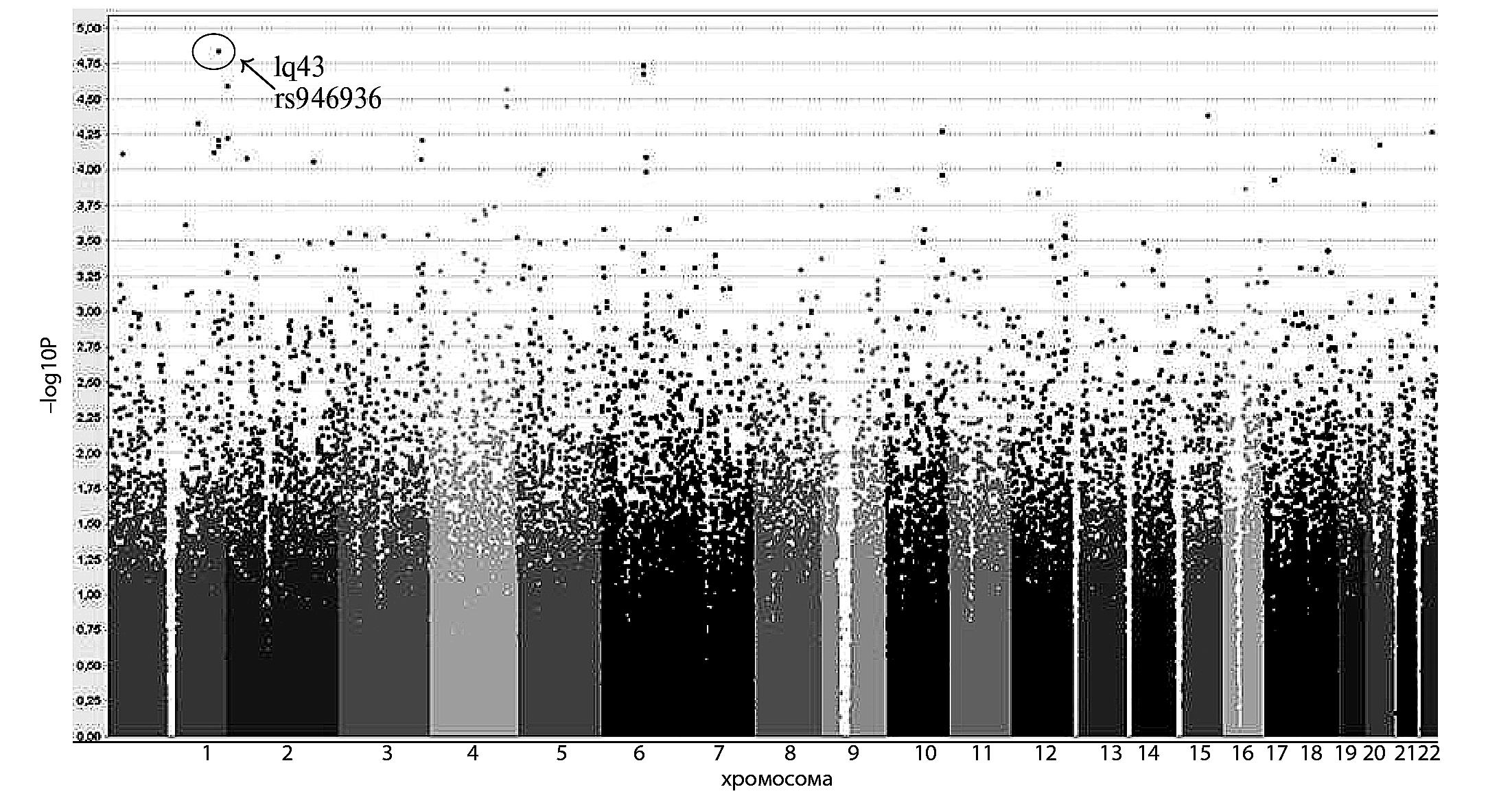 Для снижения ошибки первого рода, была применена поправка FDR-BH (False Discovery Rate Bengamini-Hochberg) на число множественных сравнений [4]. Полногеномный анализ ассоциации, выполненный у индивидов русской этнической принадлежности, выявил наиболее выраженные различия между больными ПШ и контрольной группой по полиморфным локусам, локализованным в области 1q43 (рис. 1). Наиболее высокий уровень ассоциации ПШ обнаружен с ОНП rs946936 (p = 1.42E-05) (табл. 1). По данным проекта “1000 геномов”, частота встречаемости аллеля rs946936*A в популяциях мира варьирует от 24.3% в индийской (GIH) до 51.6 % в китайской популяции (CDX) (http://www.ensembl.org/Homo_sapiens/Variation/Population?db=core;r=1:236929581-236930581;v=rs946936;vdb=variation;vf=713358).