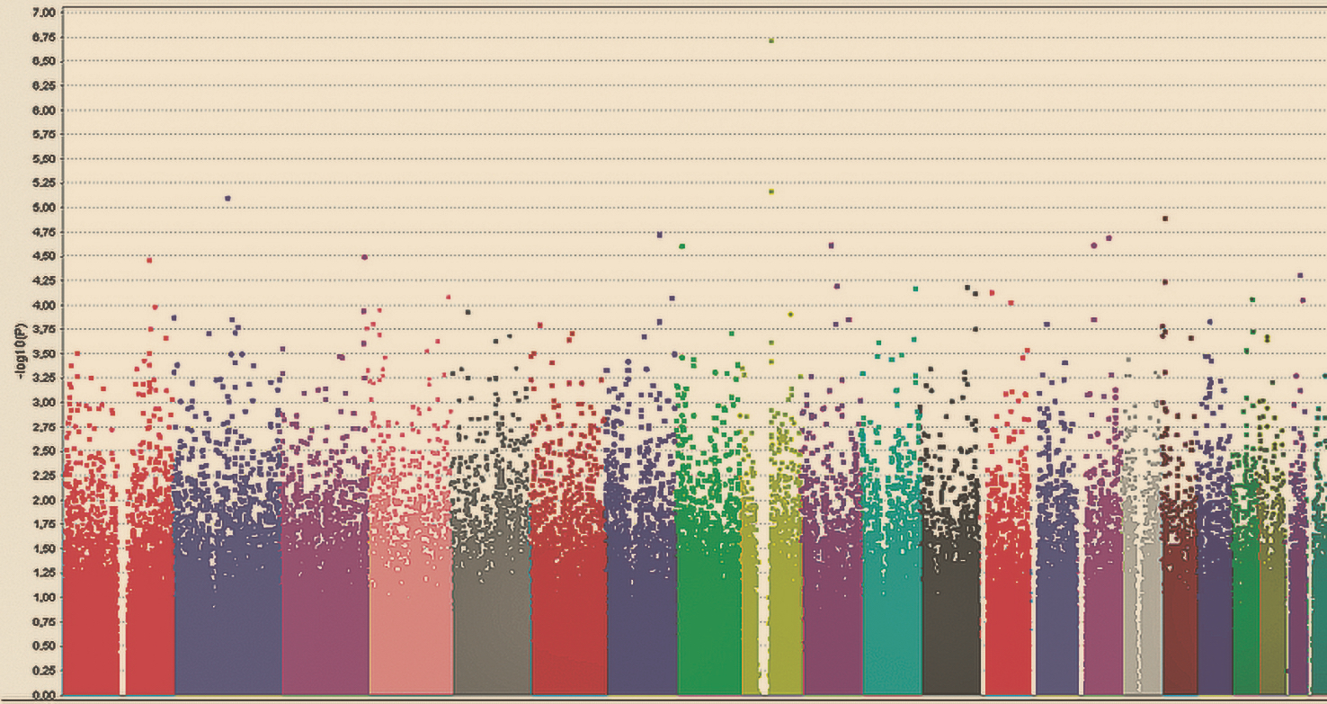 Рис. 1. Графическое изображение результатов полногеномного анализа ассоциации 395832 ОНП с параноидной шизофренией у татар (Manhattanplot). На оси X указана хромосомная локализация ОНП, на оси Y – значения отрицательного десятичного логарифма уровня значимости р-value.