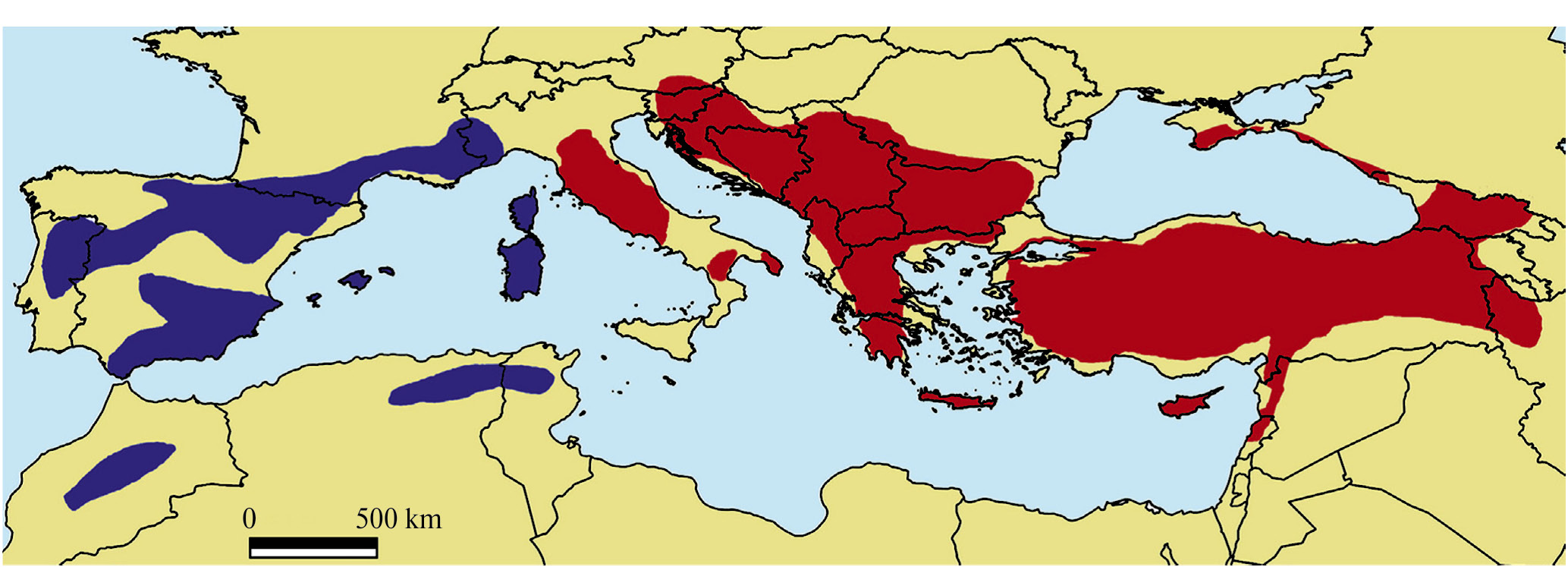 Рис. 1. Ареалы Juniperus deltoides (красный цвет) и J. oxycedrus (синий цвет) по R.P. Adams [3].