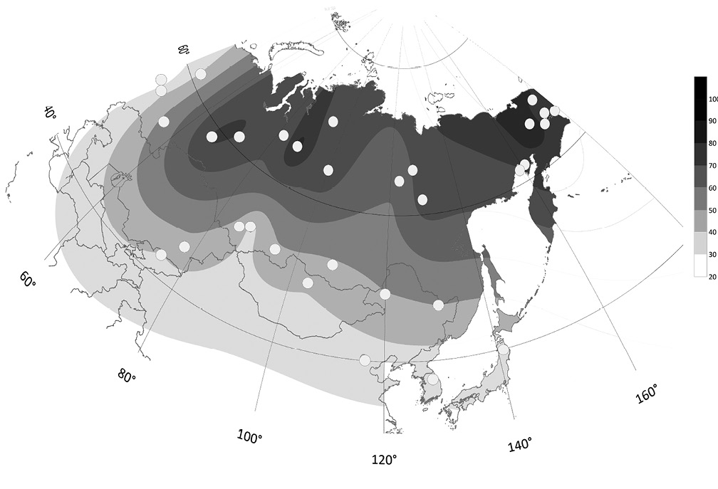 Юго-Восточная Сибирь (55) | 50.0°‒57.5° с.ш., 102.0°‒115.0° в.д. | 0.6‒8.8 | 0.873 |