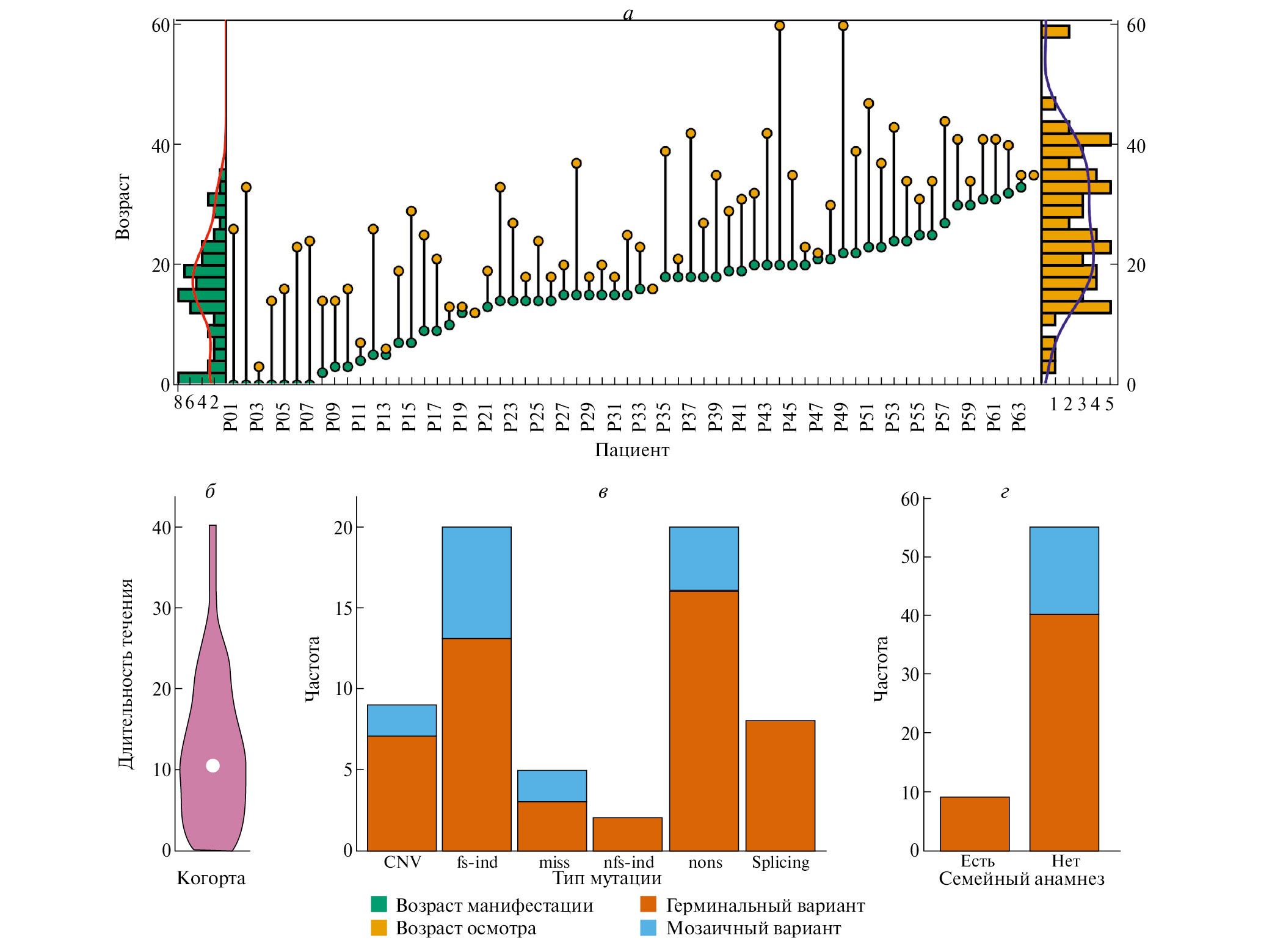 Рис. 1. Возрастная характеристика исследуемой выборки и результаты молекулярно-генетического тестирования. а – распределение возраста клинического дебюта (зеленым) и возраста на момент осмотра (желтым) в исследуемой выборке, длина сегмента соответствует длительности течения заболевания; б – плотность распределения длительности течения заболевания; в – частота встречаемости различных типов мутации в исследуемой выборке, включая герминальные (оранжевым) и мозаичные (синим) генетические варианты; г – частота семейных и спорадических случаев, включая герминальные (оранжевым) и мозаичные (синим) генетические варианты.