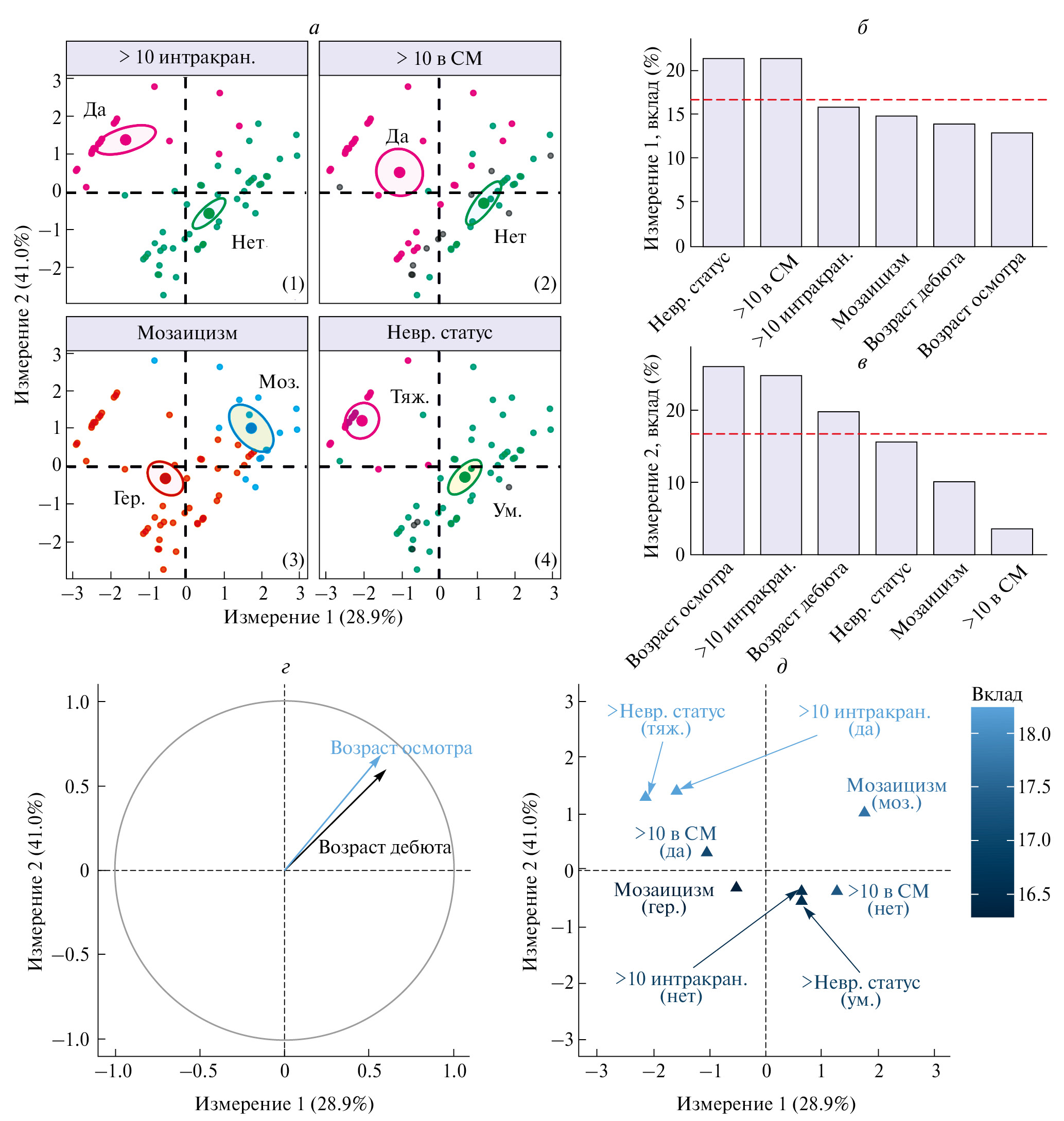 Рис. 2. FAMD клинических особенностей выборки (возраст дебюта, возраст на момент осмотра, тяжесть неврологической симптоматики, наличие более 10 интракраниальных опухолей, наличие более 10 опухолей в спинном мозге (СМ), представленность мутации в организме). а – каждая точка соответствует пациенту, отдельные панели характеризуют выборку (1) по наличию более 10 интракраниальных опухолей, выборку (2) – по наличию более 10 опухолей в спинном мозге, (3) – по представленности патогенного аллеля в организме, (4) – по тяжести неврологического статуса. Серые точки соответствуют отсутствию информации по конкретному признаку; б, в – вклад исследуемых признаков в измерения 1 и 2; г, д, – положение признаков в координатах проекции.