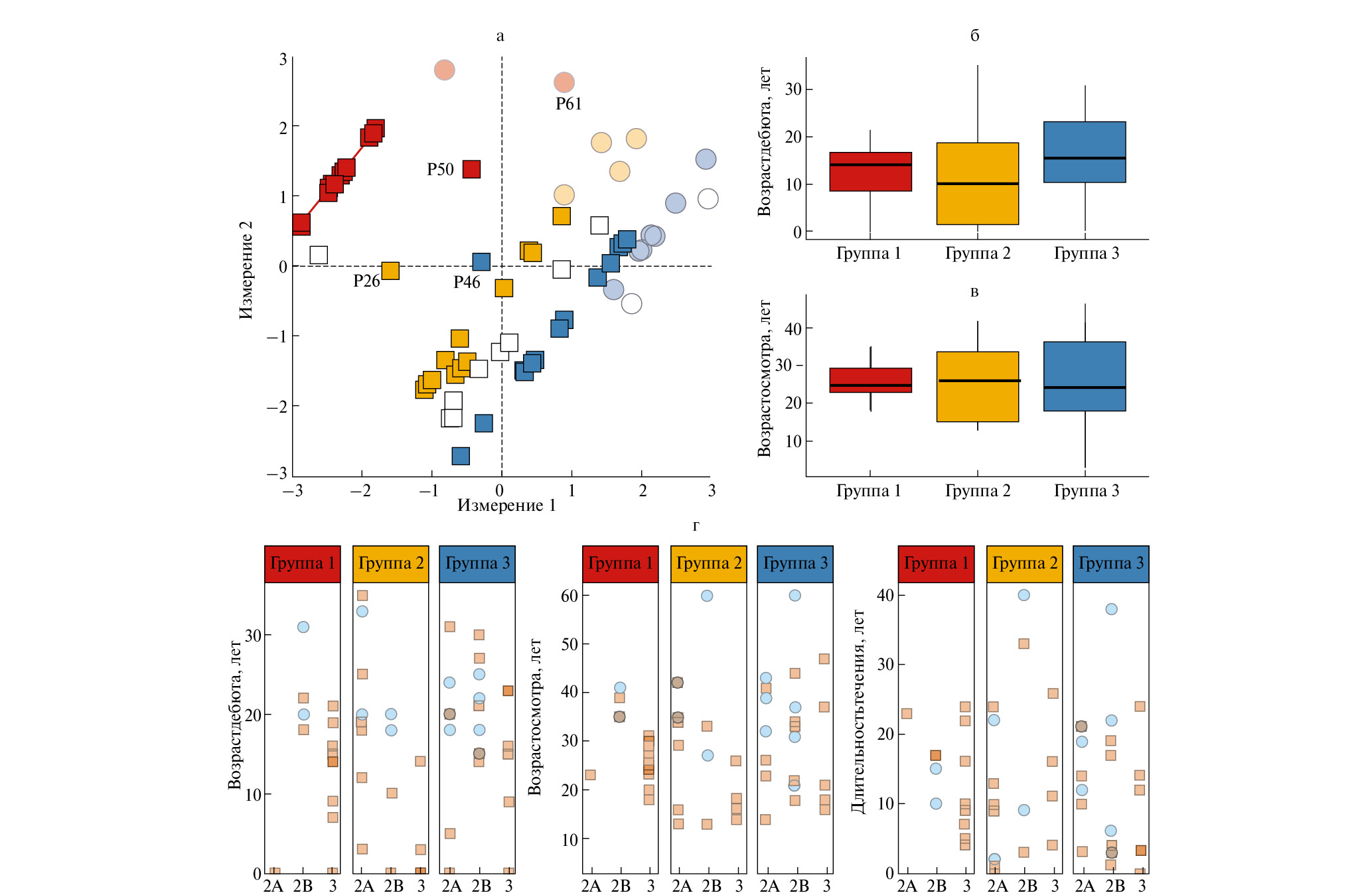 Рис. 3. Сравнение выделенных групп распространенности опухолевого процесса. а – FAMD клинических особенностей выборки. Красный цвет соответствует группе 1, желтый – группе 2, синий – группе 3. Квадратная форма маркера соответствует пациенту с герминативной мутацией, круглая – с мозаичной; б – распределение возраста дебюта в выделенных группах; в – распределение возраста осмотра в выделенных группах; г – возраст клинического дебюта, возраст осмотра, длительность течения заболевания для различных категорий по Halliday в выделенных группах. Оранжевый квадратный маркер соответствует герминальным вариантам, синий круглый – мозаичным.