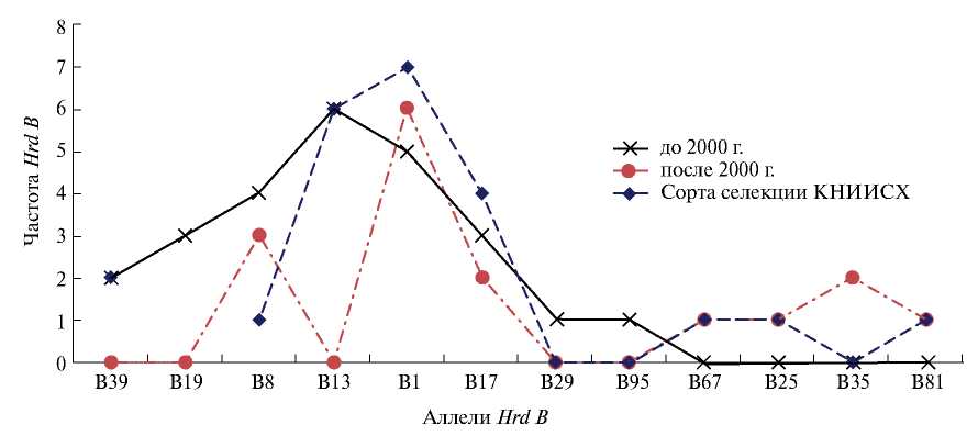 За период с 1989 по 2007 г. методом электрофореза были исследованы 225 сортообразцов ярового ячменя различного эколого-географического происхождения (в том числе 40 местных стародавних образцов), привлекаемых в разные годы в качестве родительских форм в селекционные программы института [10, 15]. Сравнительный анализ выборок сортообразцов за период по 2007 г. показал, что, несмотря на широкое вовлечение в гибридизацию (Красноярский НИИСХ) исходных форм с аллелями А1, А23, В3, В21, В29, в сортах и перспективных селекционных образцах института эти аллели отсутствовали. С другой стороны, отмечен преобладающий вклад родительских форм с аллелями А2, А12, В1, В8, В13, В17 в сорта института и в целом в сибирские селекционные сорта [10].